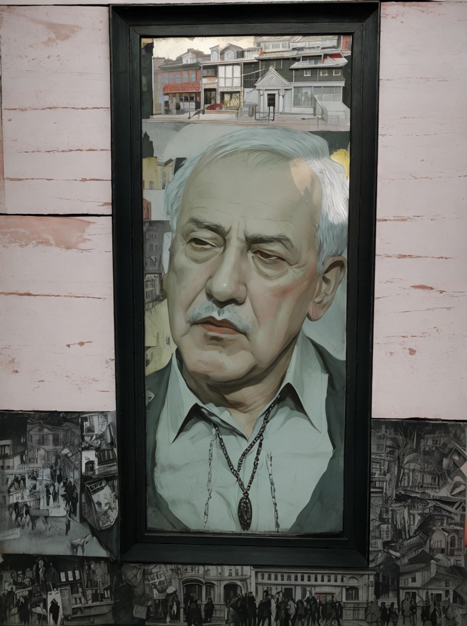 Surreal painting of woman with stern expression & multitude of faces in elongated canvas