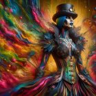 A slender figure adorned in a painted bodysuit melds with a vibrant, abstract background. Swirls of color and paintbrushes suggest creativity and artistic expression in a captivating visual blend.
