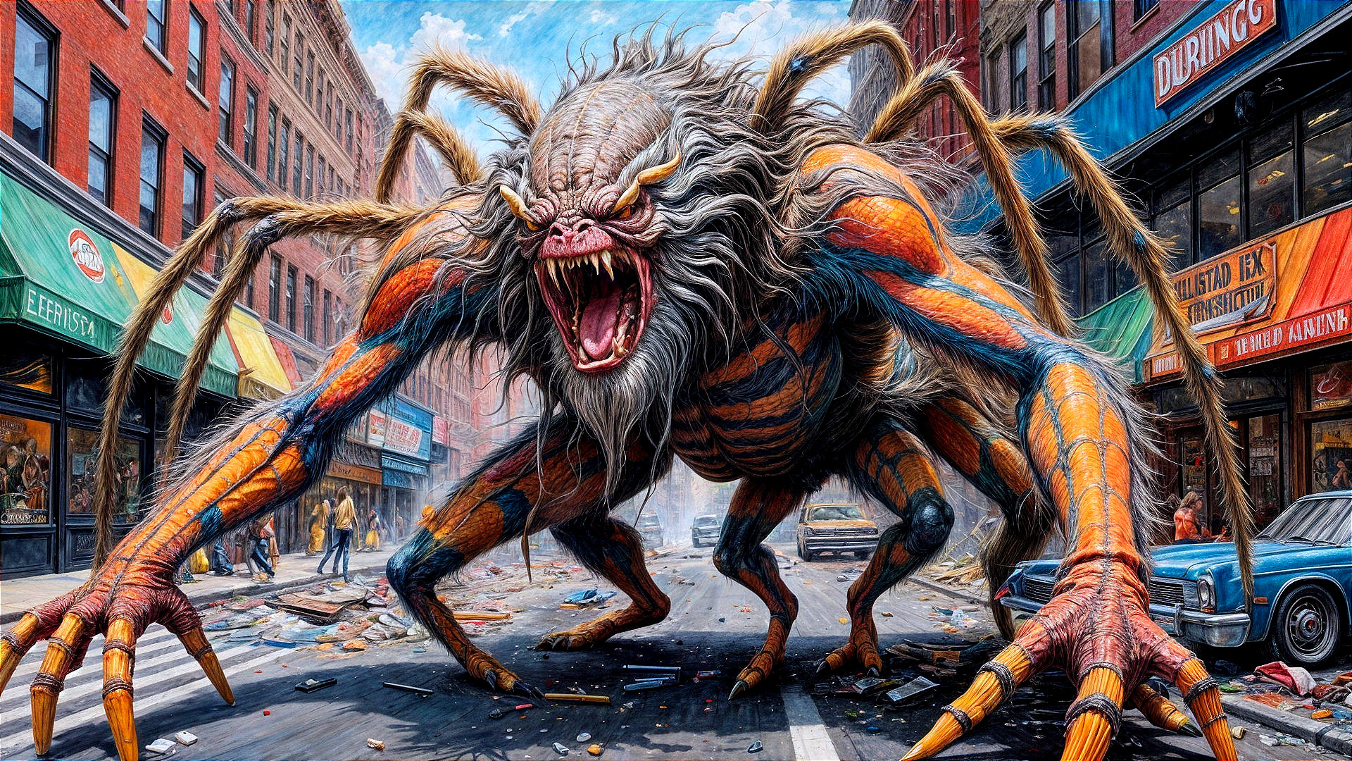 A monstrous, arachnid-like creature with a large, hairy head, menacing fangs, and multiple orange and black striped limbs with sharp claws, stands in the middle of a city street, its mouth wide open in a roar, with debris scattered everywhere, the scene illuminated by the dramatic lighting of