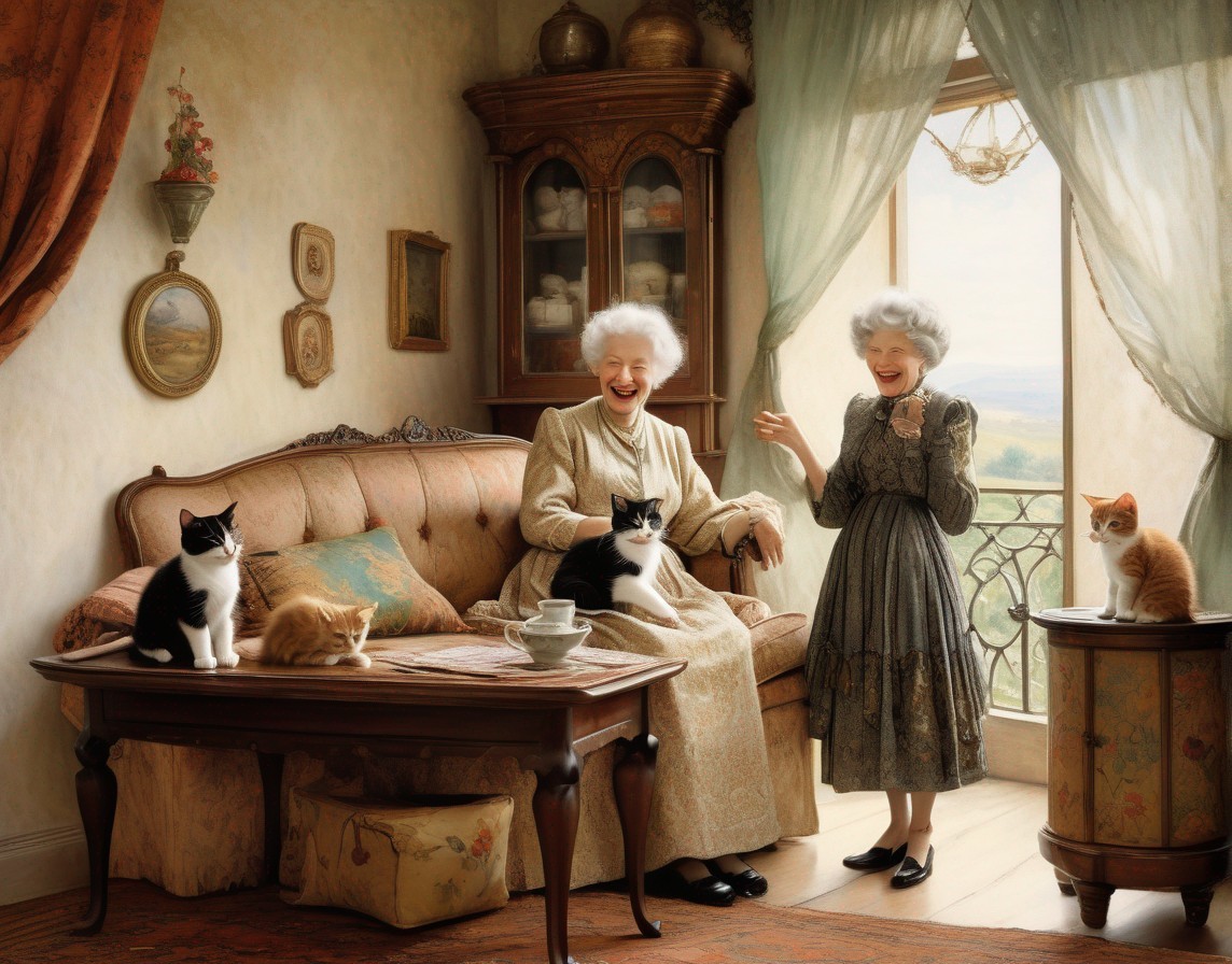 Three elderly women laughing on a couch with two cats, in a cozy room with vintage décor and a painting on the wall.