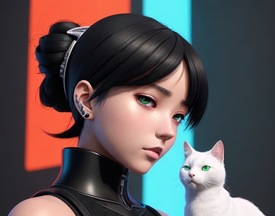A digital artwork of a woman with a high bun and green eyes next to a white cat against a vibrant background.