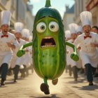 A cartoonish cucumber character, with wide eyes and a shocked expression, runs frantically through a street while being chased by a group of cheerful chefs in white uniforms.