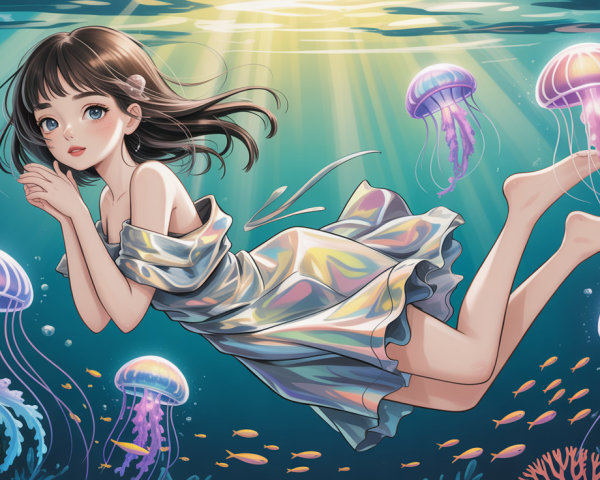 A stunning anime desert landscape unfolds, featuring vibrant dunes under a bright sky. Adorable magical critters frolic among the cacti and shimmering sands, creating a whimsical and enchanting scene.