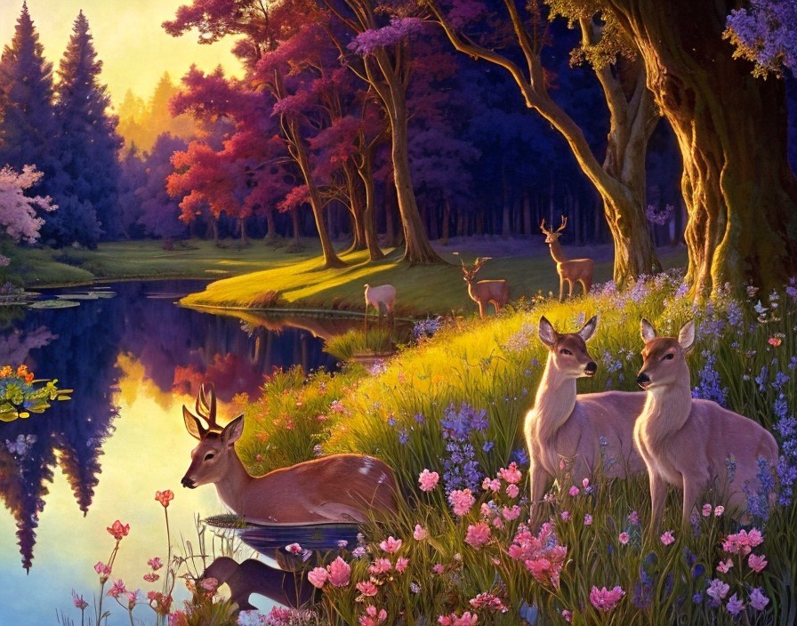 Prompt: Peaceful welcoming scene in the style of Mucha, in the foreground are several anatomically accurate, beautiful deer grazing in a flower-covered meadow with delicate plants and lacy ferns. On the left is an azure-colored pond reflecting quite clearly the deer and surrounding colorful flora, and in the background are slender trees through which glows a beautiful setting sun.