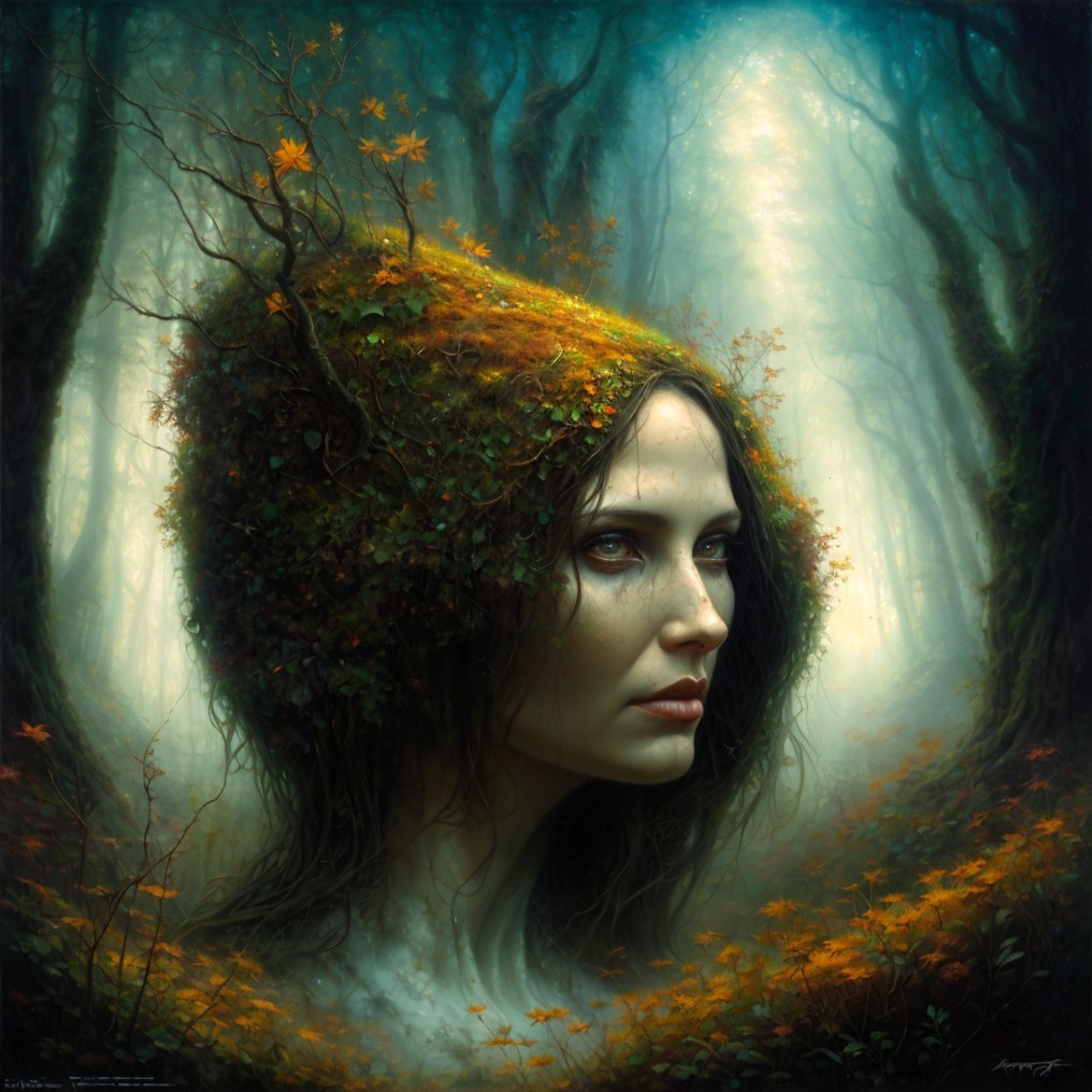 Serene Figure in Mystical Forest with Natural Crown
