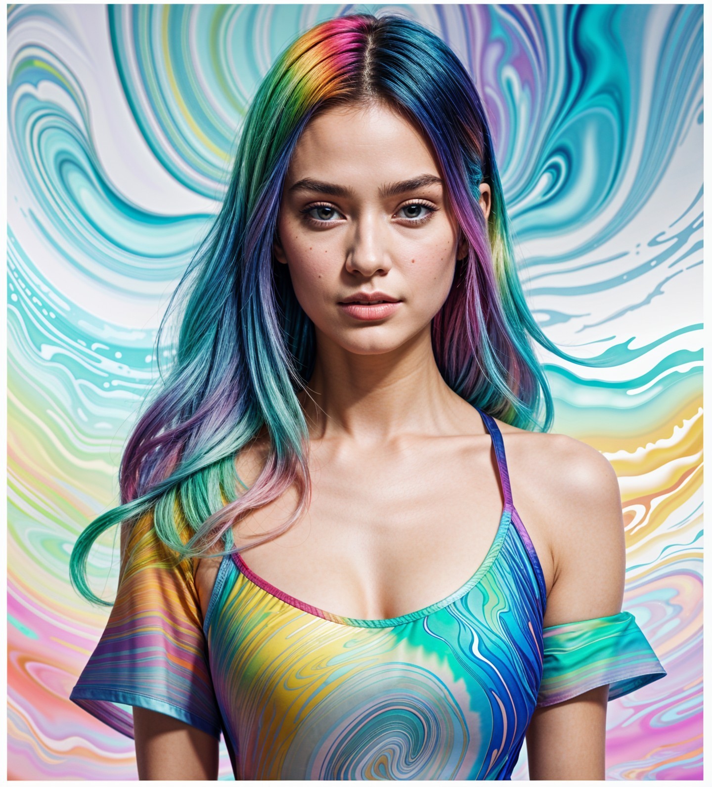 Vibrant brushstroke art, iridescence, minimalist overlay, zen-inspired lines, shimmering opalescent colors, sheen iridescent hues, watercolor effects, acid neonoir vibe,.cel-shaded, precise Gelsculpt 64K, uhd, hdr, VFX-inspired, octane render illustration 1.5, comic book art, bold, expressive brushstrokes and a mix of geometric shapes and soft curves to convey a sense of movement and emotion, evoking a surreal, otherworldly connection, hallucinatory feel, silk moire seamlessness, fluid couture textile design, sleek embellishments, masterful doodling with fine ink pen, abstract stylized 3D effects, dyed hues, watery overspray of paint, juvenile and playful, detailed and precise execution, depth, artful blend of colors, artistic textures, dynamic and engaging composition. wet-on-wet watercolor effects by ho baron, warm coloring, 1970s art, shadow mapping 1.3, 3 layers of dof, layered, multi-textured assemblage, geometrical, symmetrical, somber, bluish coloring, gradient inking in hues, plasticity 1.6, complexion 1.4, coherent, uhd,hdr, octane render illustration 1.5 by earl moran, Juveniile diva, line-art merged with collage-style by Man Ray, continuous line drawing, Outlier drawing, encaustic, Bloom-Effect, overexposed, overspray of paint. Cel-shaded, acid wash, subtle coloring. Diffused lighting, brightness 1.9, stylized artwork by William Bradley and Barclay shaw in warm tones. symmetrical, brightness 1.3, slightly fragmented depiction, blurred realism, f, minimalist geometrical approach, sensual, feminine beauty, sensually composed, realistic style, vivid pastels of ho baron, detailed facial features, warm color palette, minimalistic yet expressive, artistic finesse, warm natural lighting, captivating gaze, delicately muted and desaturated tones. Gently blurred textured layers, subtle expressiveness. distance, radiance, fractured connections. delicate textures,