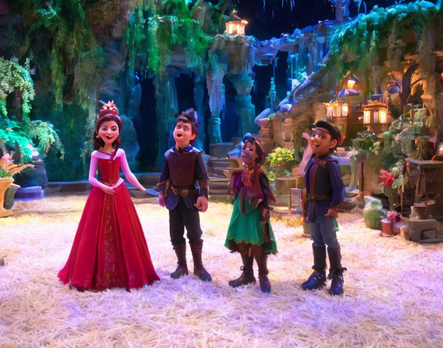 Princess in red dress with children in magical forest glade