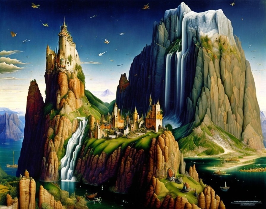 A fantastical landscape with towering mountains, cascading waterfalls, and majestic castles amidst drifting birds and ships below.