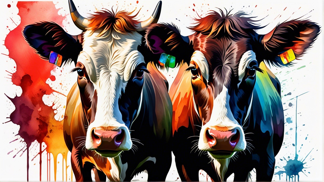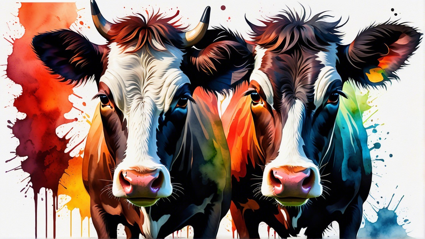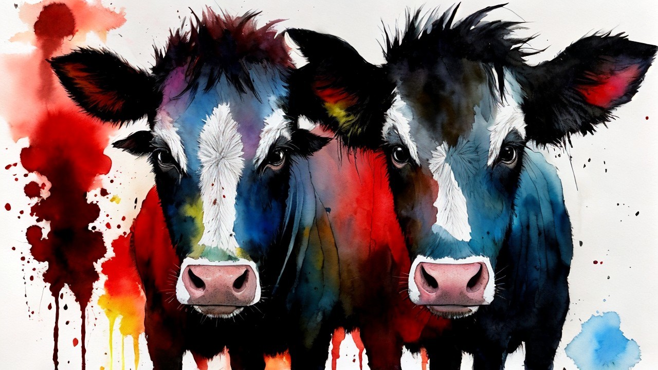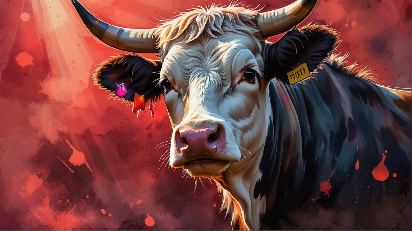 The image depicts a stylized cow with striking features, including prominent horns and a colorful, abstract background featuring warm tones and splashes, giving it an artistic flair.