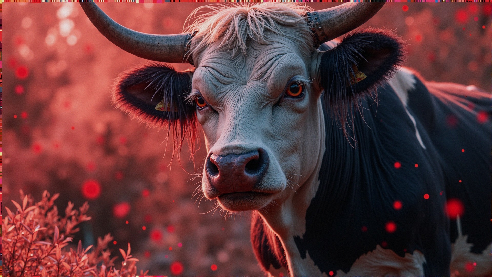 The Angry cow. A cartoon resident is a Angry cow , old, disheveled, shaggy, dull-witted , whirlwind of colors, red soot, sketching, medium background, grunge, alcohol ink, play of light and shadow, quick sketch, unusual horror, watercolor, dark art Broken Glass effect, iridescent and luminescent, beautiful, rays, reflections, mythical, volumetric