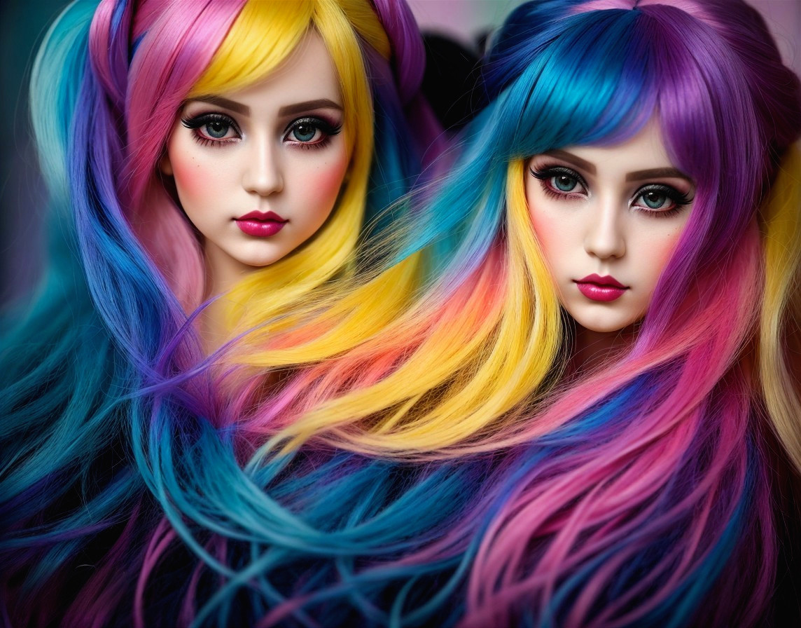 Two dolls with vibrant multicolored hair and detailed makeup features.