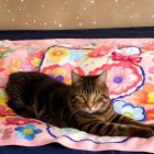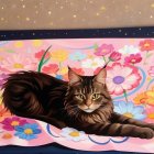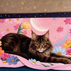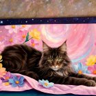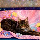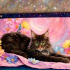 A majestic cat reclines on a soft, pastel-colored blanket adorned with vibrant flowers, set against a dreamy cosmic background of swirls and stars, creating a whimsical, enchanting scene.