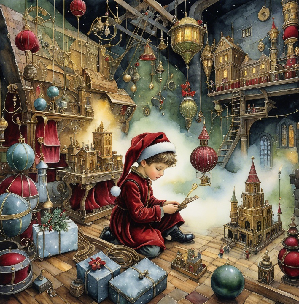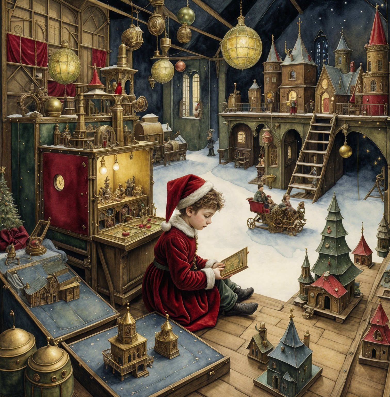Christmas Legend of the beautiful Christmas boy in a magical toy factory.,, 3rd century European miniature art. Velvet Black, Shabby, Dull Gold, olive green, burgundy, Golden Ratio, Surreal Fantasy, Elegant, High Definition Ultra Fine 3D Line, Zenangle Style, Watercolor Patchwork , Arthur Rackham Style, Paul Kidby, Gediminas Prankevicius, Jacek Jerka, Extremely Detailed, Intricate, Thoughtful, HDR, Fractal, Beautiful, Award Winning, Fantasy Look, Fantasy, Crisp Quality