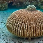 A surreal scene features a serene woman lounging atop a large, textured orb in tranquil blue waters, surrounded by rocky cliffs, evoking a dreamlike and peaceful atmosphere.