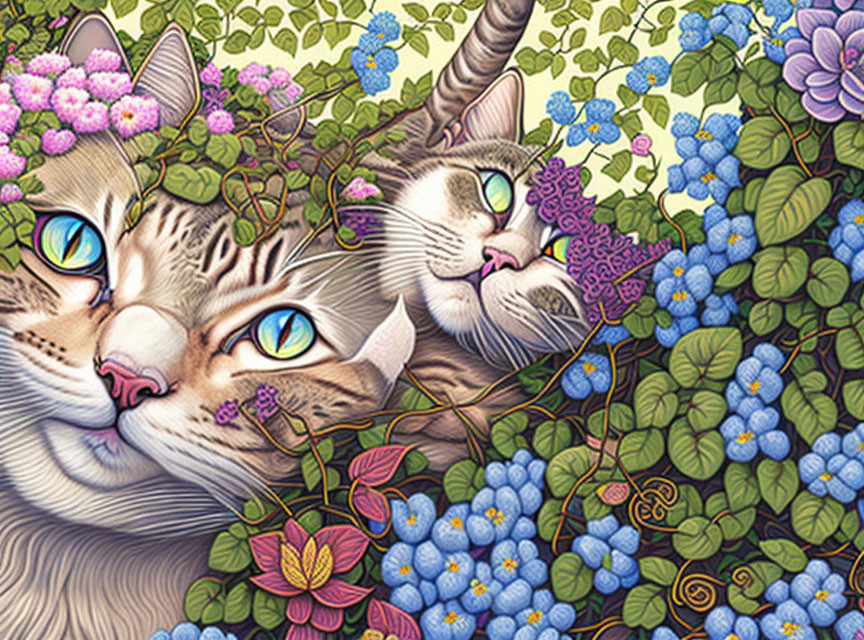 A cat in a jungle, climbing through the tangle of flowers and vines. Add the missing ear to the cat in front. Both cats have two ears. The eyes of the cats are clear and visible. The cat is anatomically correct. Perfect symmetry. In the style of Don Bluth, Emily Balivet.