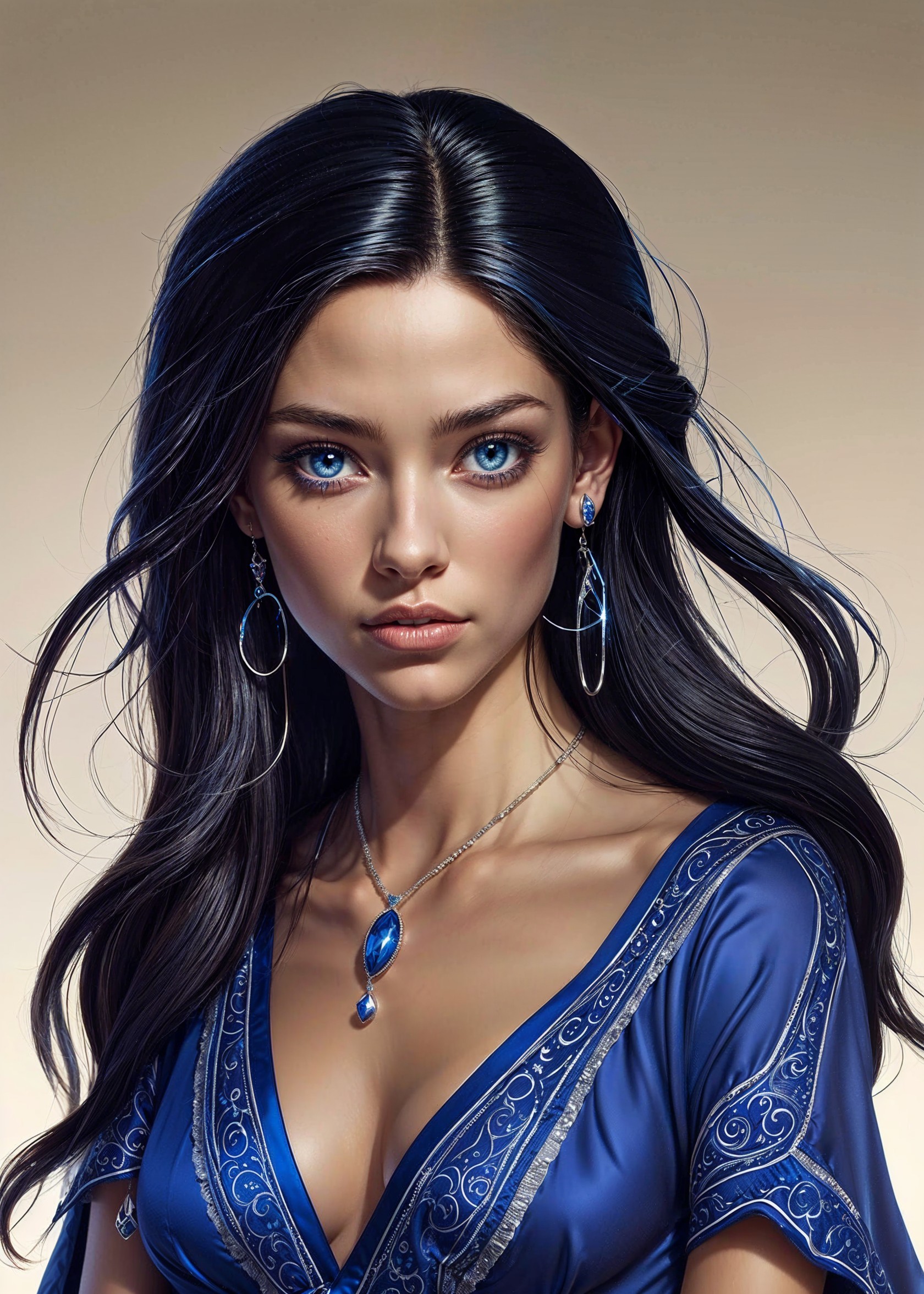 A young woman with long, dark hair and striking blue eyes wears a flowing blue dress adorned with intricate designs. Her elegant earrings and pendant complement her graceful appearance.