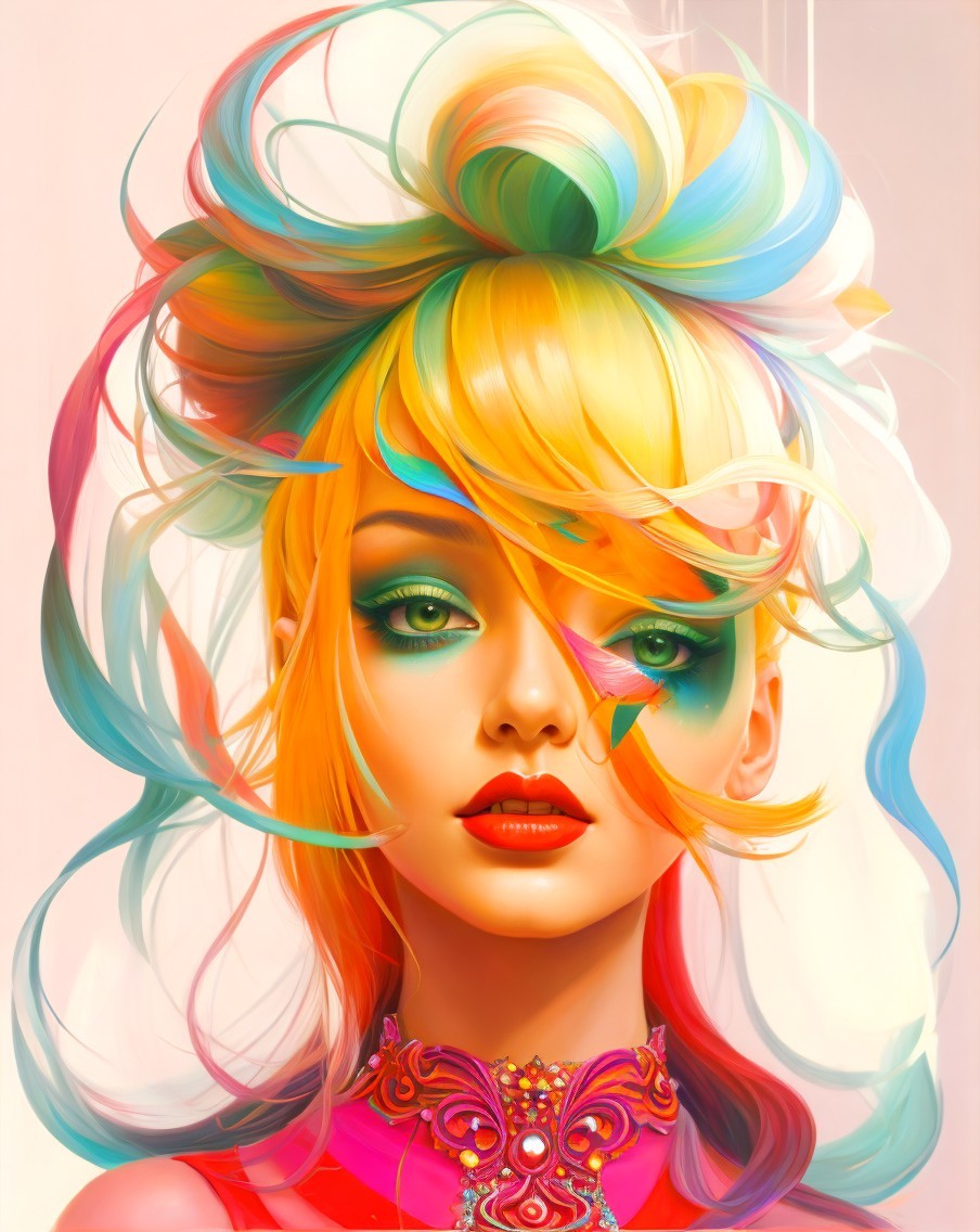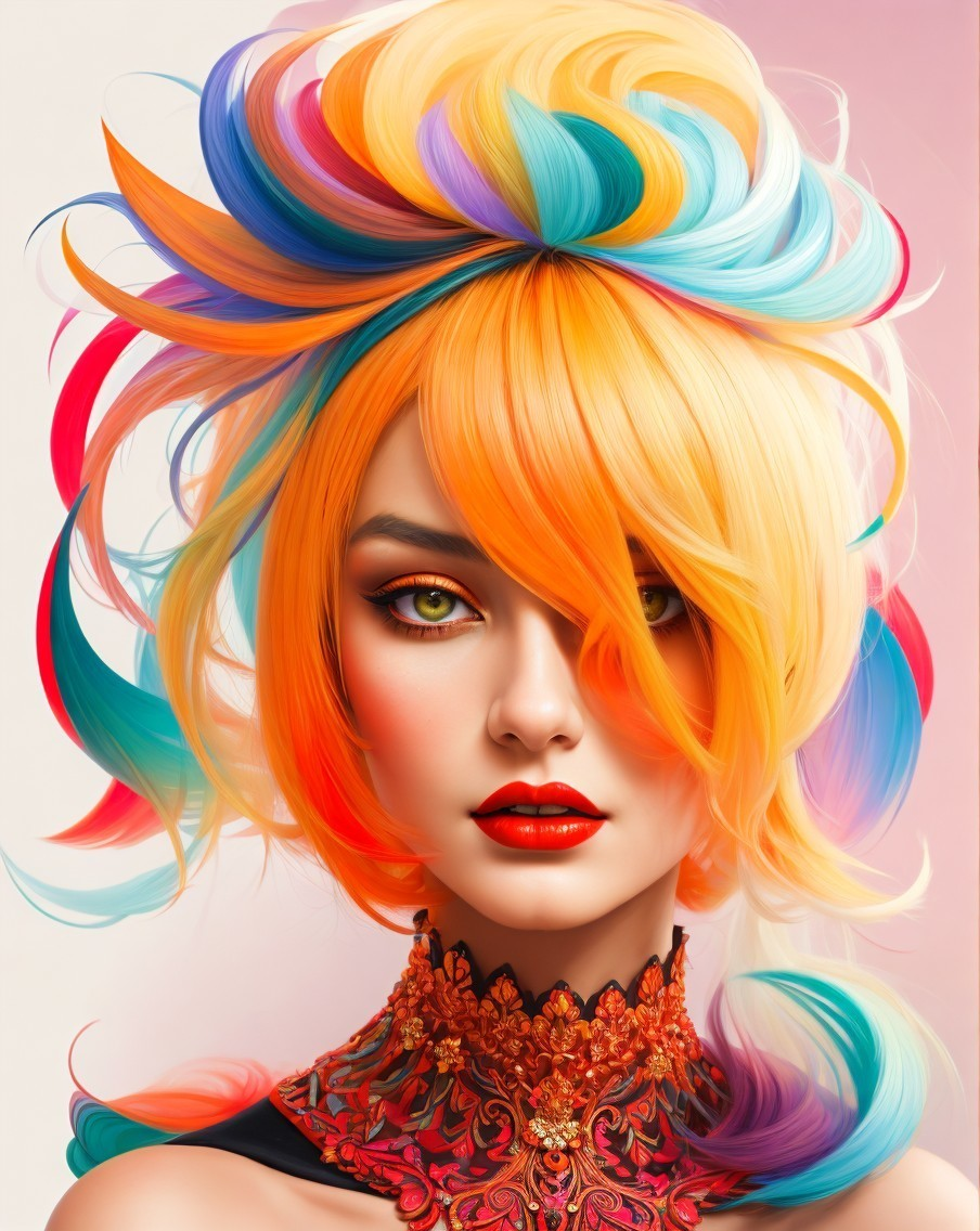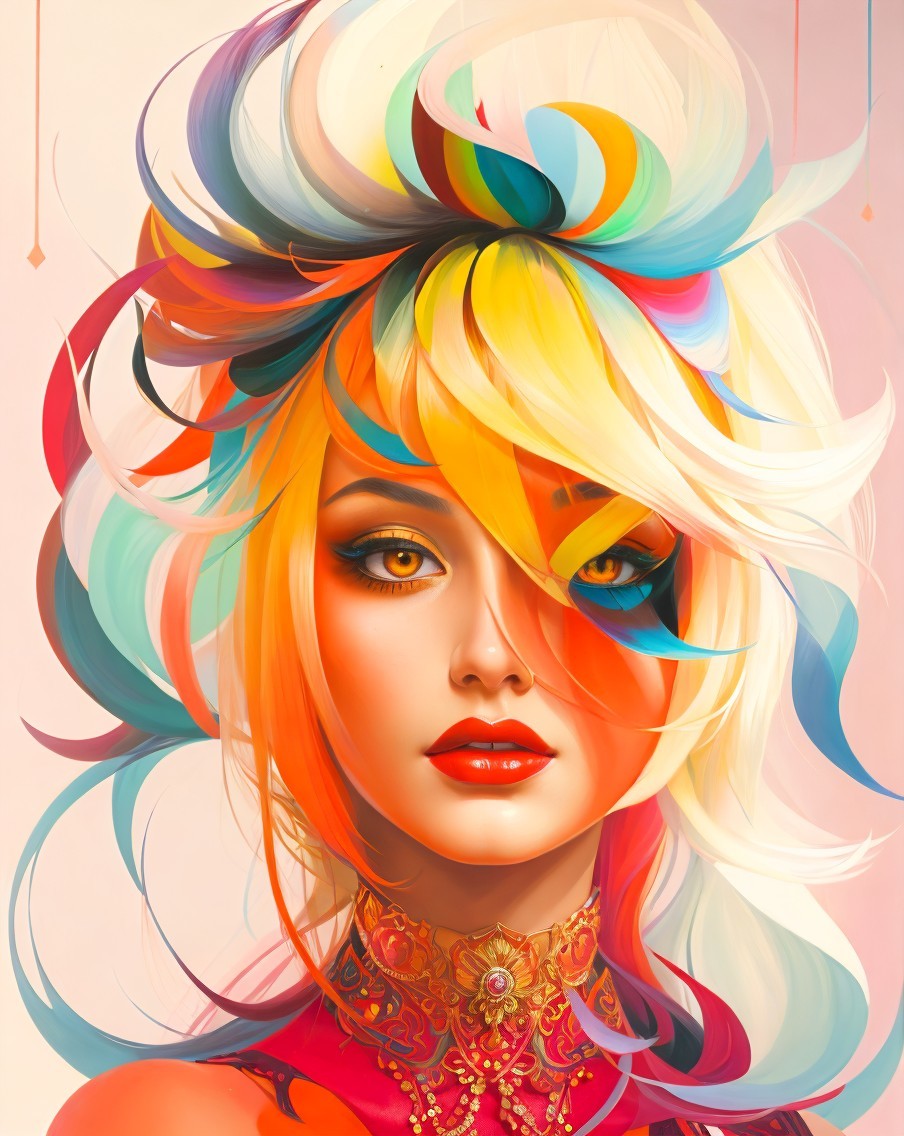 Surreal Portraiture, beautiful female face, oil on canvas, triadic color scheme red black orange, conceptual illustration, ultra-fine details, dimmed lighting, magical realism, tints of cubistic style, fauvistic cuts, joyful and mysterious, fantasy creature, intricate eyes, mystical aura, dark color palette with pops of gouache hues, enchanting and surreal, concept art. 3d effects 1.8, ambient occlusion 1.5, shadow mapping 1.3, raytraced shadows 1.8, impasto, frottage, wavery texture, stenciling, brightness 1.4, zentangle lines, streamline_moderne, tints of Bowley and Overton Loyd, Background by Florianne Becker and Georgia O'Keeffe, mezzotinto, maximalism, radiance, highly detailed strokes, octane render illustration,luminosity 1.3, plasticity 1.6,