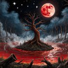 A surreal landscape features a gnarled tree at the center, surrounded by a flowing river of lava. An eerie red moon hangs in a starry sky, illuminating the desolate, shadowy surroundings.