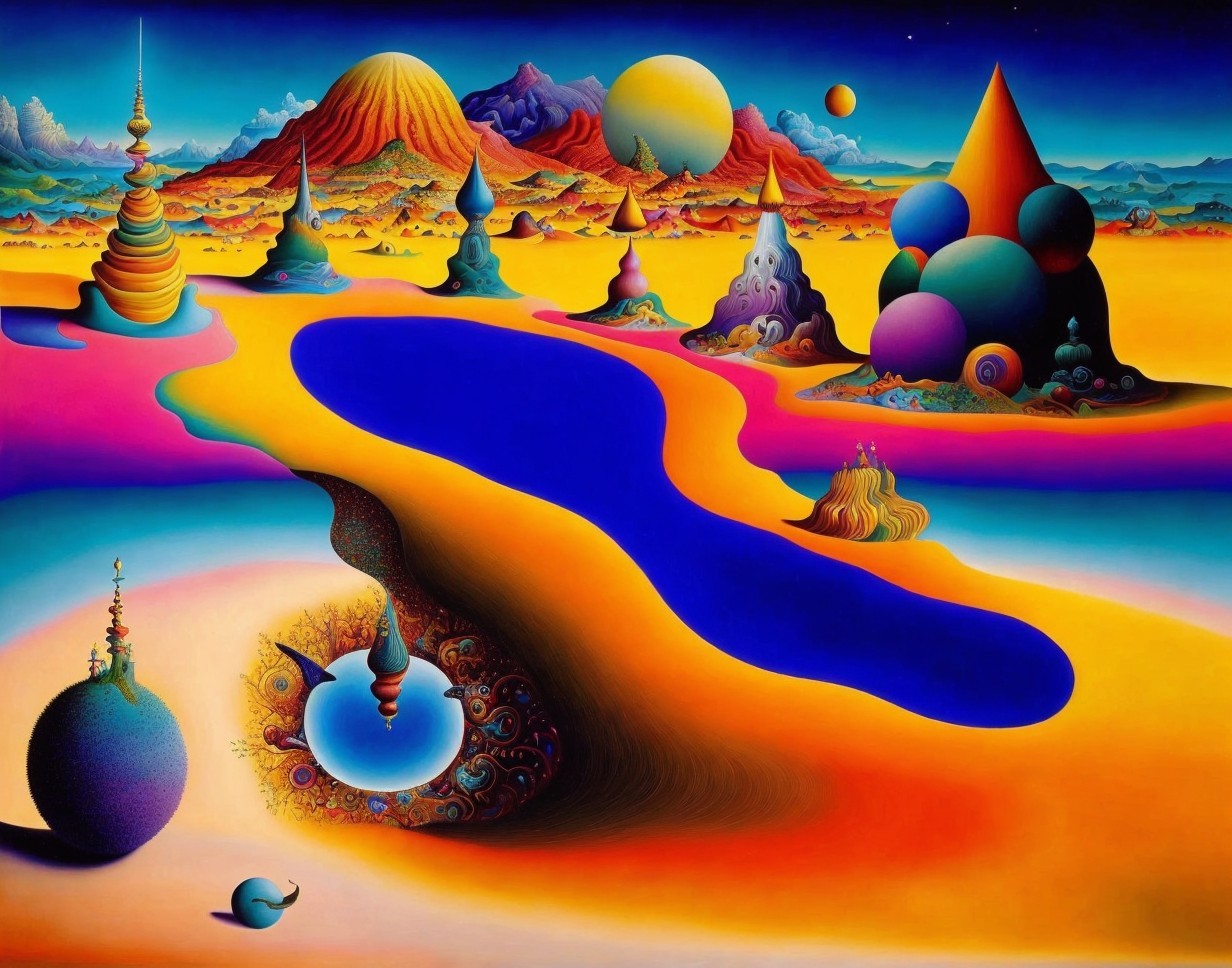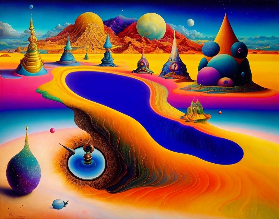 Prompt: Surrealistic painting of an otherworldly landscape, blending cosmic elements with earthly motifs, reminiscent of Salvador Dali and Hieronymus Bosch; a colorful, vibrant tapestry of symbolism and imagination, offering a captivating and inspiring journey for the viewer. Highly detailed, intricate, hyperrealism.