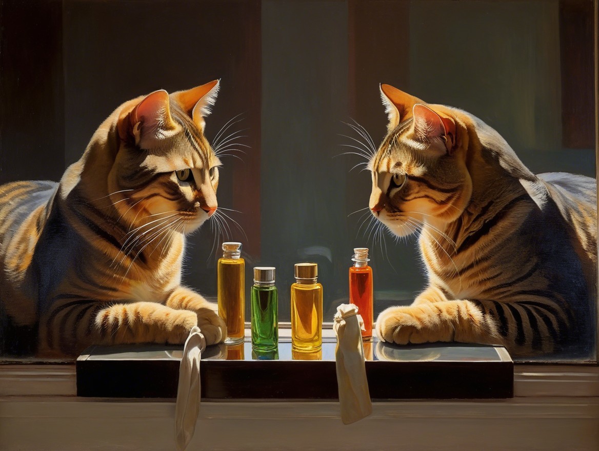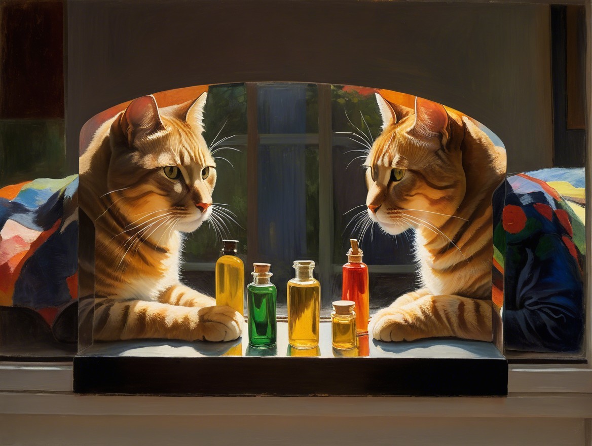 Orange Tabby Cats by Colorful Glass Vials on Windowsill