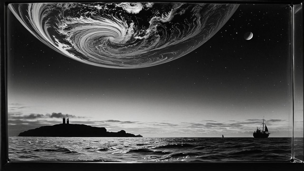 A woman gazes out of a window at a vast, starry ocean landscape, featuring a distant lighthouse on a rocky shore and a massive planet looming in the sky, creating a surreal, dreamlike atmosphere.