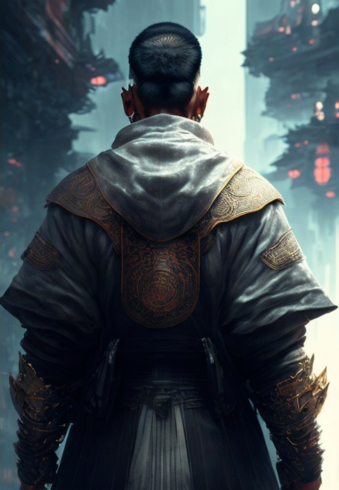 A person from behind in elaborate medieval-style armor looks towards a misty, futuristic cityscape with towering structures.