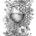 A stylized glass of water sits at the center of intricate floral designs, featuring sunflowers, grapes, and various blossoms, all framed against a vibrant green background.
