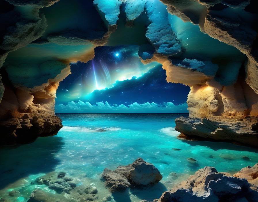 A breathtaking view from a cave opening onto a serene ocean under a starry night sky with a radiant nebula.