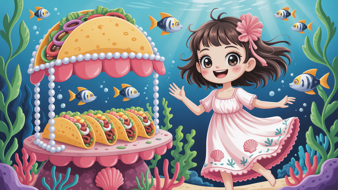 A whimsical scene unfolds as a charming girl in a cute anime nightgown runs a vibrant taco stand submerged in a colorful underwater world, surrounded by playful sea creatures and coral reefs.