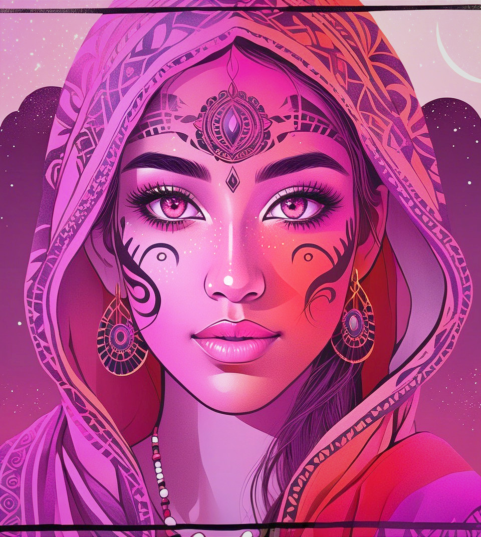 Intricate tribal and folklore designs adorning a woman's face, gradient colors blending seamlessly, tetradic color scheme light-pink rosewood-pink light-red magenta, simple background with dappled hues, cosmic and astronomical elements subtly incorporated, complex motifs intertwining, stylized, vivid cymatics creating a visual symphony, luminous and ethereal designs, catenaries adding a touch of elegance, fractal patterns merging seamlessly, circuit-like linework enhancing the composition, organic mandelbrot fractals weaving a naturalistic tapestry, stunned, subsurface scattering 1.4, divisionism, plasticity 1.3, complexion 1.1, futuristic shimmer, vivid watercolor accents, expressive brushwork, fabric details, emotional depth, stylized gothic elegance, glowing light effects, surreal atmosphere, raytraced shadows, full-fledged excessive forms, high-resolution, intricate details, complex coloring and lighting, wavery textures, tranquil, serene, deep coloring, purple and lilac gradients, reflections and highlights, dramatic lighting. Abstractly contoured, complex inking, minimalist line art with watercolor washes, quaint, thinned paint, byzantine face type, hues by Ed Binkley, warm tones and a vintage feel, negative lucas numbers, LiDAR point cloudmandalas adding a spiritual dimension, vivid bubble-like circular patterns for a whimsical touch, flares of light accentuating the scene, psychedelic elements for a mind-bending experience, warm tones enveloping the artwork, asymmetrical concentric details creating depth, geometrical precision in every stroke, surreal and fantastical artistry, highly detailed with vibrant hues, sketchbook illustration brought to life, intricate patterns inviting closer inspection, fantasy theme transporting viewers to another realm.