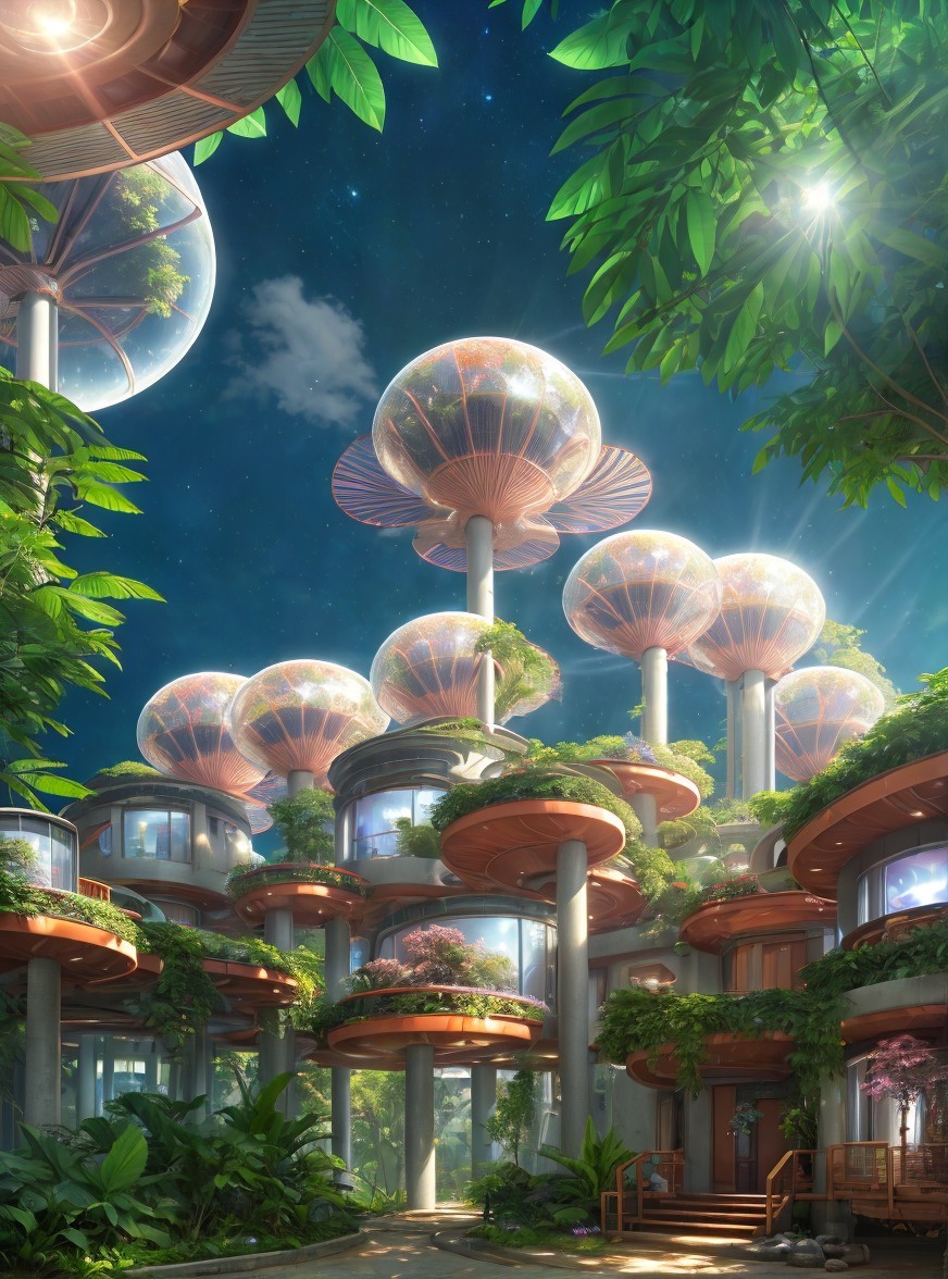 Prompt: two futuristic round multi-storey houses with a transparent dome, with glowing windows, in a tropical valley, among green overgrowth and tropical trees, a spaceship next to the house, in the rays of the rising sun, concept art with 16L resolution, extremely detailed, high definition, photorealistic, Thomas Kincaid, Ferdinand Knab, Niki Boehme