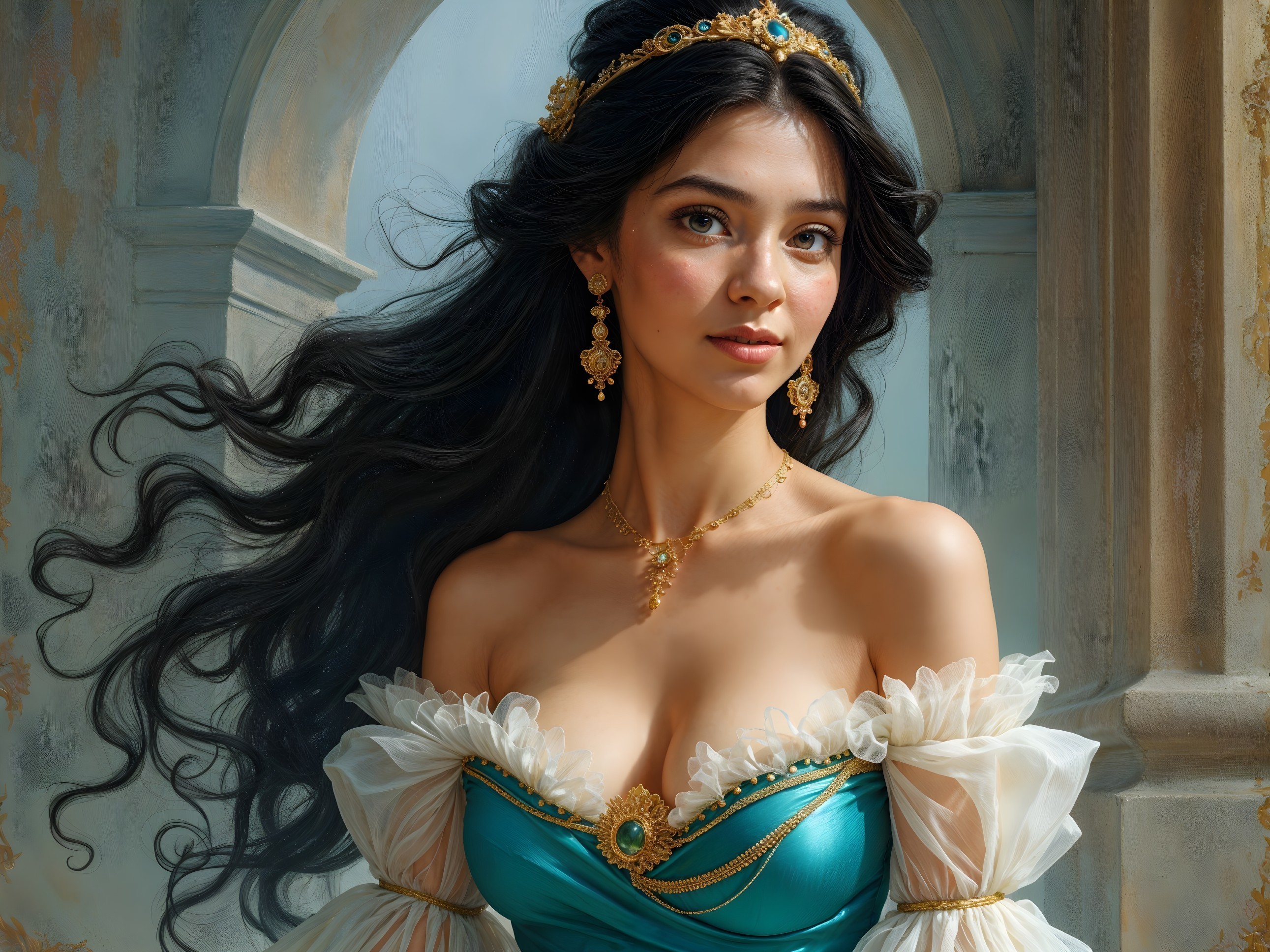 A young woman with flowing dark hair wears an elegant turquoise gown adorned with gold accents. She is surrounded by ornate architecture, exuding a regal and enchanting presence.