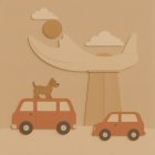 A vibrant LEGO scene features a colorful tower with a banana and clouds, an orange van, and a playful dog on top, set against a sunny sky and green landscape. Fun and whimsical!