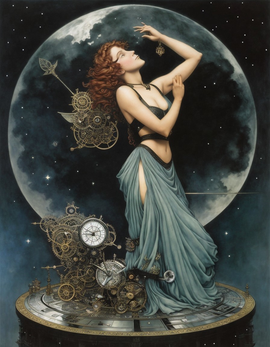 A mystical figure with flowing hair, adorned in a corset, poses dramatically before a celestial backdrop. Intricate clockwork gears and a large moon enhance the enchanting atmosphere.