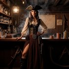 A confident woman dressed as a pirate stands in a dimly lit tavern. She wears a dark corset, flowing blouse, and a long skirt with a high slit, complemented by a tricorn hat and tall boots.