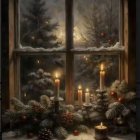 A cozy winter scene seen through a warmly lit window, featuring snow-covered trees and mountains. Decorated with festive lights, candles, and ornaments, it evokes a peaceful holiday ambiance.
