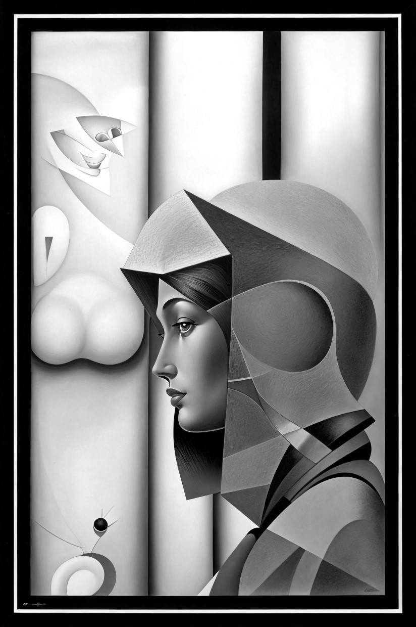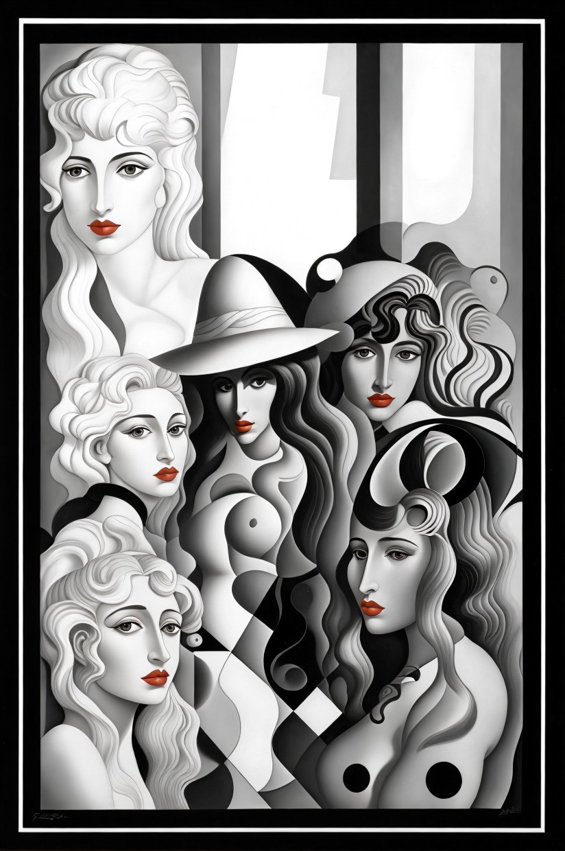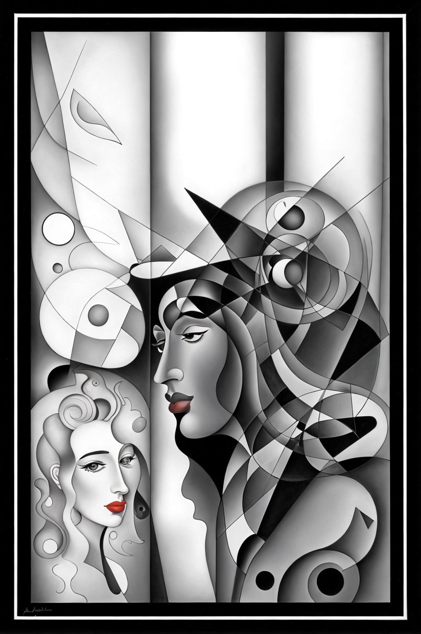 Geometric Cubist-style painting of abstract female figures in urban setting