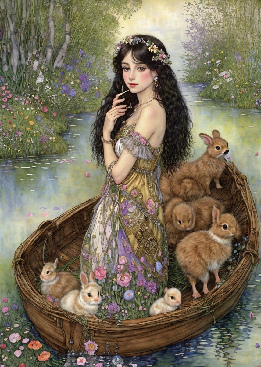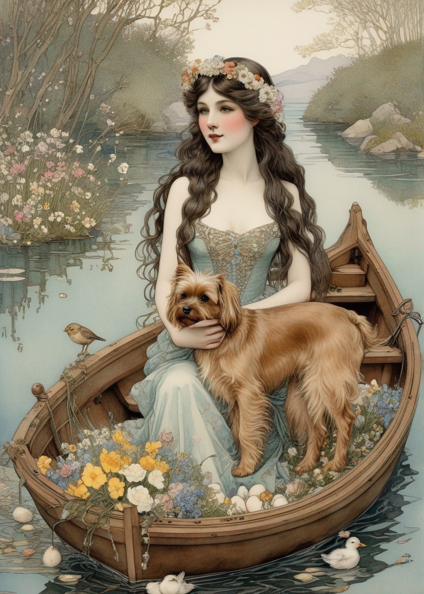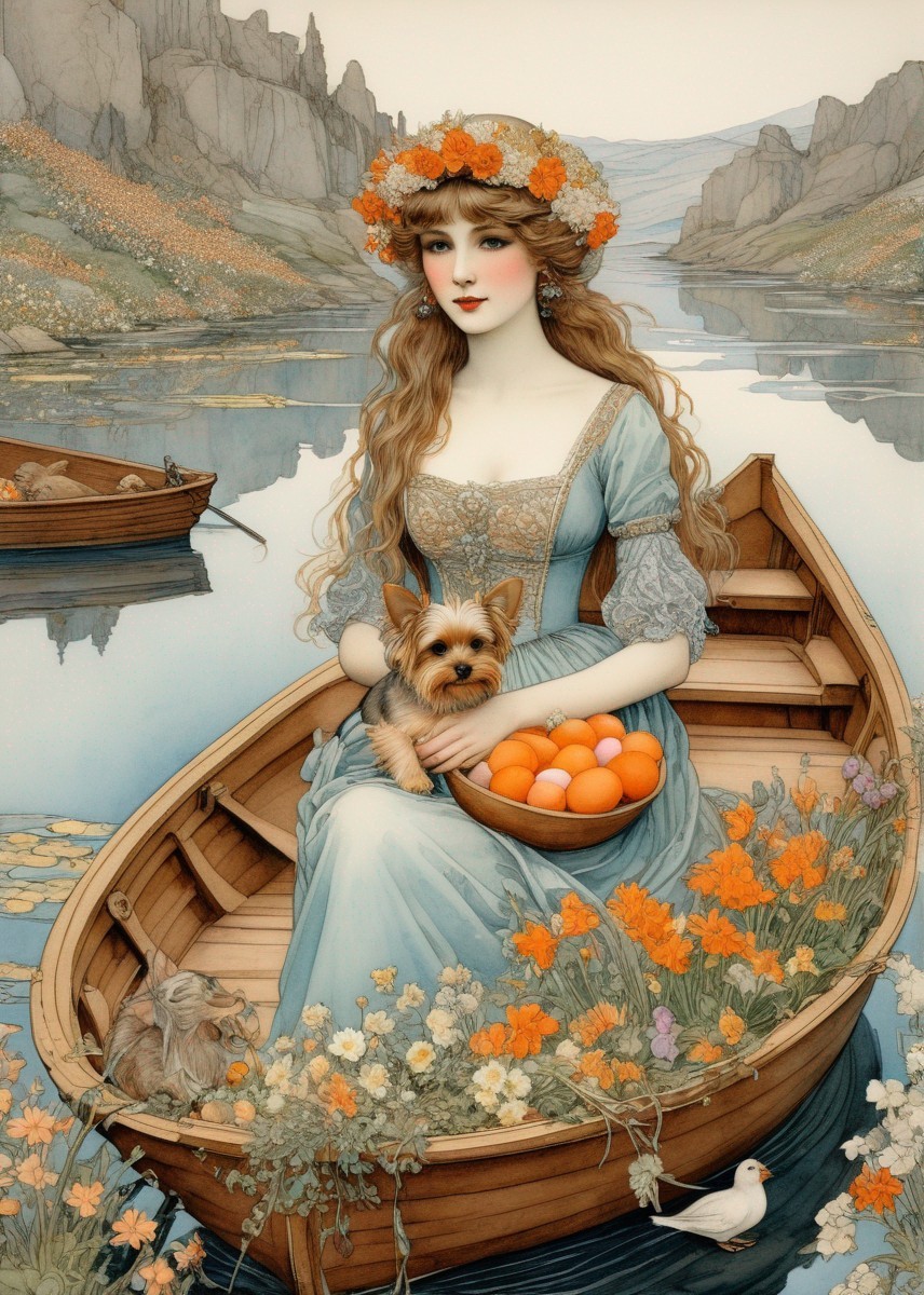 An illustrated woman with an orange floral wreath sits in a boat with two dogs, amidst a serene river flanked by mountains.