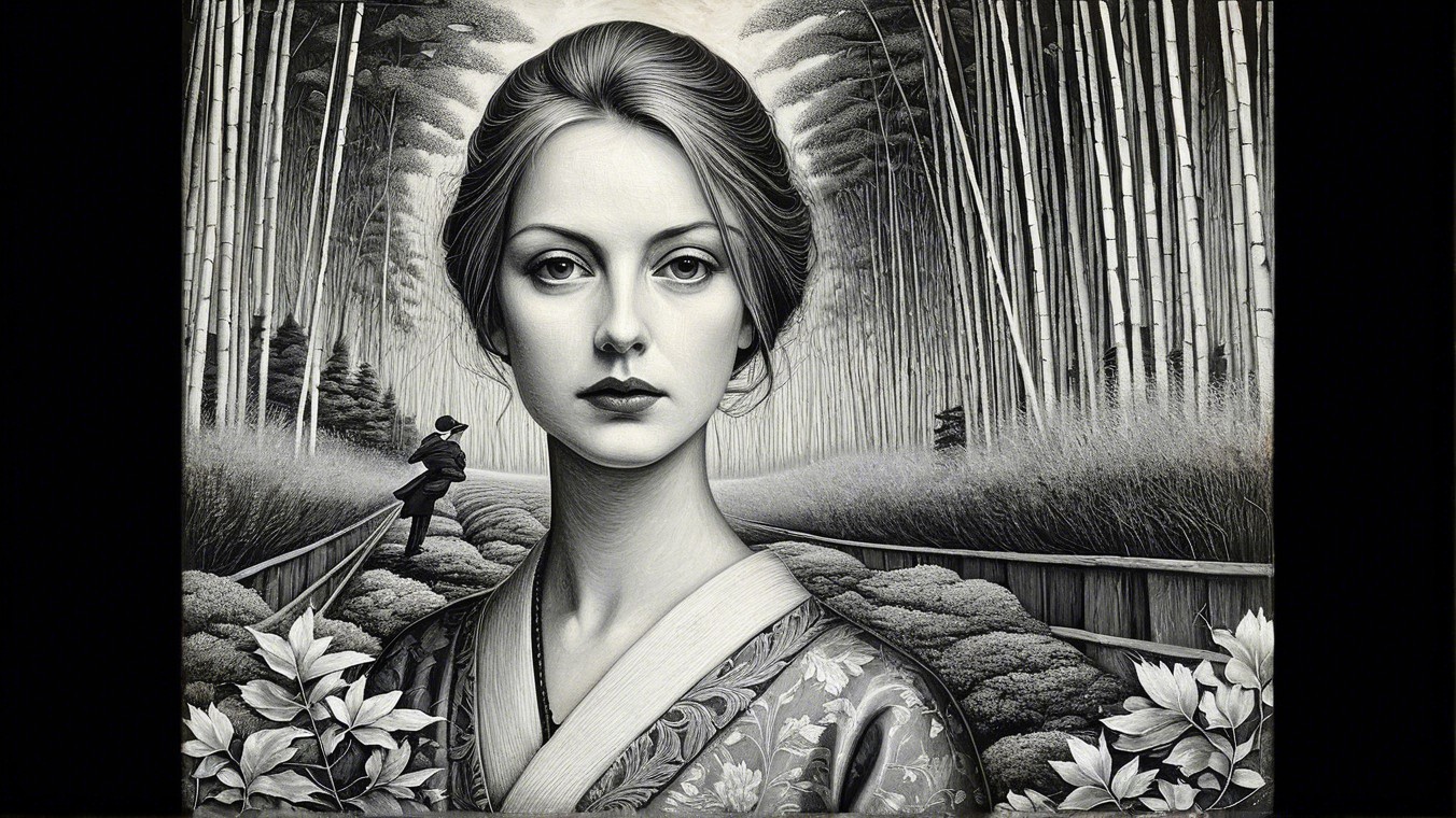 A striking monochrome portrait of a woman with a serene expression, surrounded by stylized trees. In the background, a figure in a suit holds a box, creating a mysterious atmosphere.