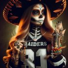 A woman adorned with intricate Day of the Dead face paint, featuring vibrant colors and bold patterns. She holds a shimmering orb, wearing a decorative sombrero and layered jewelry.