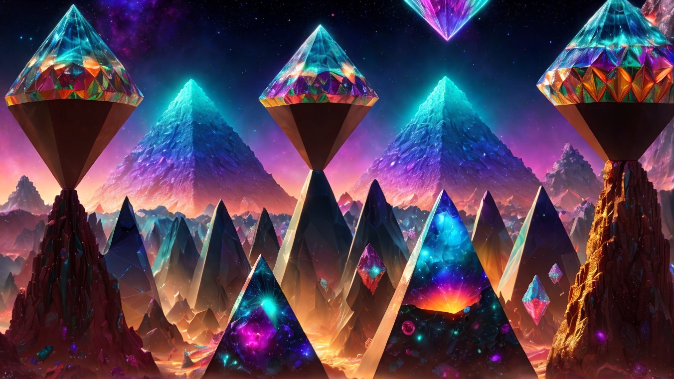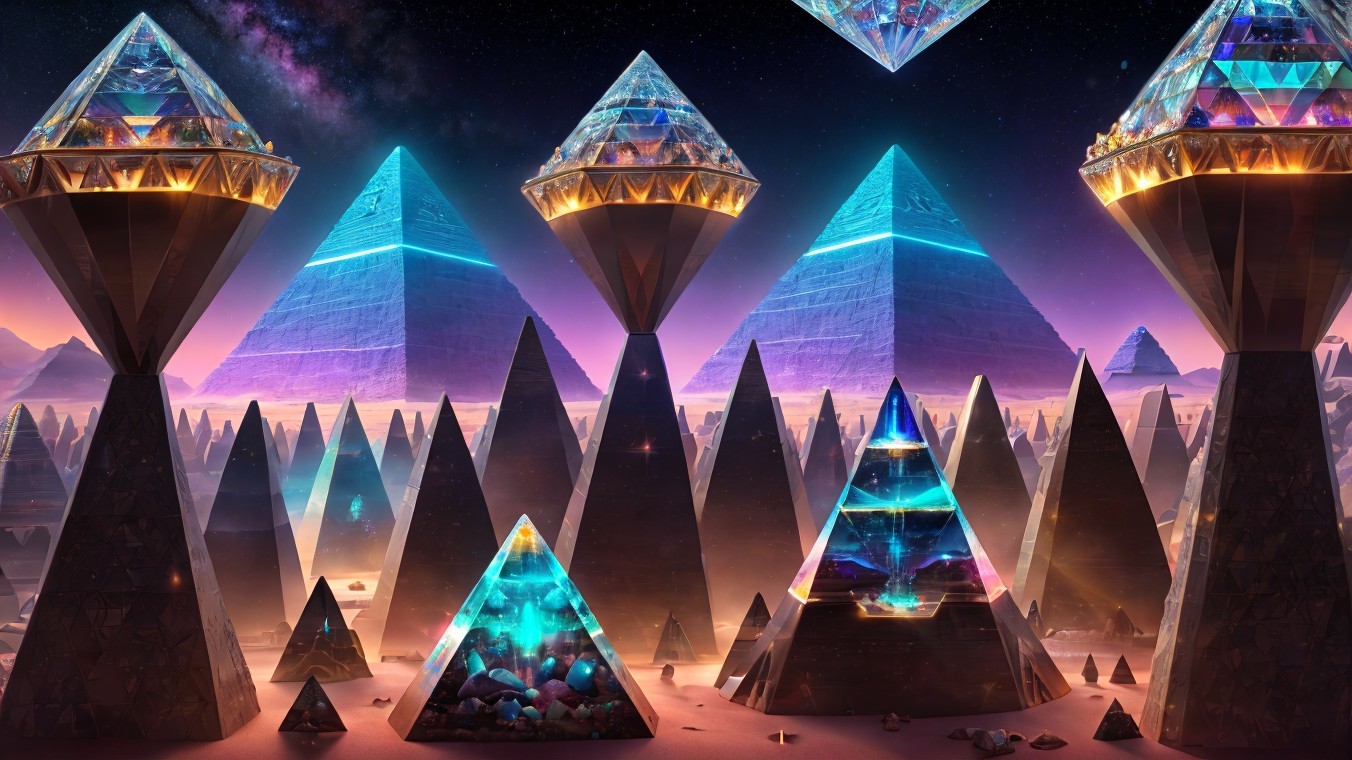 Pyramid made of stone and giant sparkling crystal geodes, divine and sacred temple, alien civilization, intricate geometric patterns, futuristic technology, esoteric religious texts, sacred geometry, long pathway to wormhole portal, desert oasis, intertwined landscape, otherworldly atmosphere, vibrant colors, cosmic lighting, intricate details, surreal blend of nature and sci-fi elements, digital art, high resolution, mystical ambiance