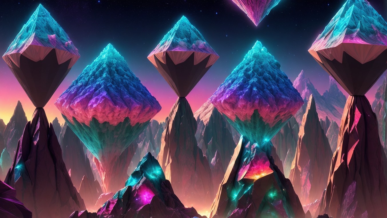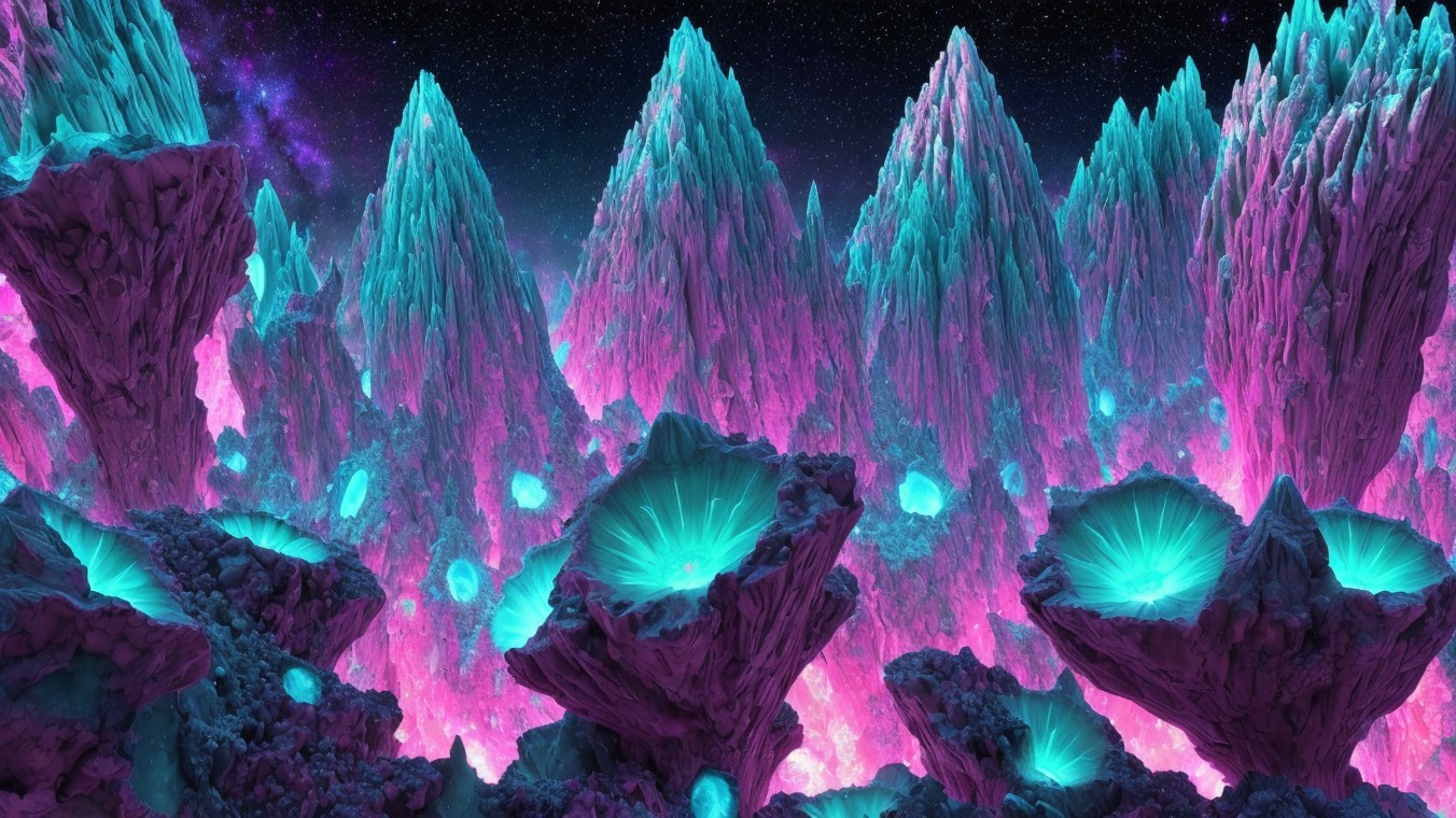 An omnipotent extraterrestrial cactus entity. Vibrant cosmic colors, intricate fractal patterns, crystal-like textures, futuristic space theme, surreal galaxy background, hues of maroon, aqua, and coral pink, glowing elements, sharp geometric shapes, digital art, high resolution, detailed and mesmerizing design, glowing neon lights, cosmic energy vibes, by digital artist Beeple, Artstation.