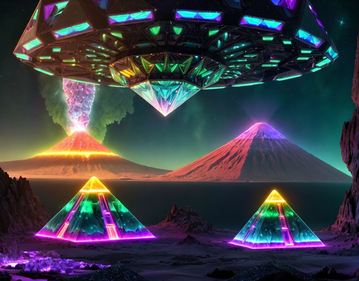 UFO with hypnotic geometric lights flying above a tropical island with colossal crystals and an erupting volcano. High-tech alien laboratory in a cosmic pyramid assimilated with abstruse sacred geometric patterns and advanced alien technology. Earth tones with neon highlights. Dark cyan, yellow to green and purple glowing crystalline structures, minerals crystals, geode crystals, phosphorescent geometric honeycomb hexagon patterns. flying saucers, pyramid with runes and colossal mineral crystals. Ultra Realistic and dynamic landscape under a complex cosmic sky. galactic DMT art, hallucinogenic visionary vibes, shamanic LSD art, and the ethereal DMT realm. In the style of Cameron Gray