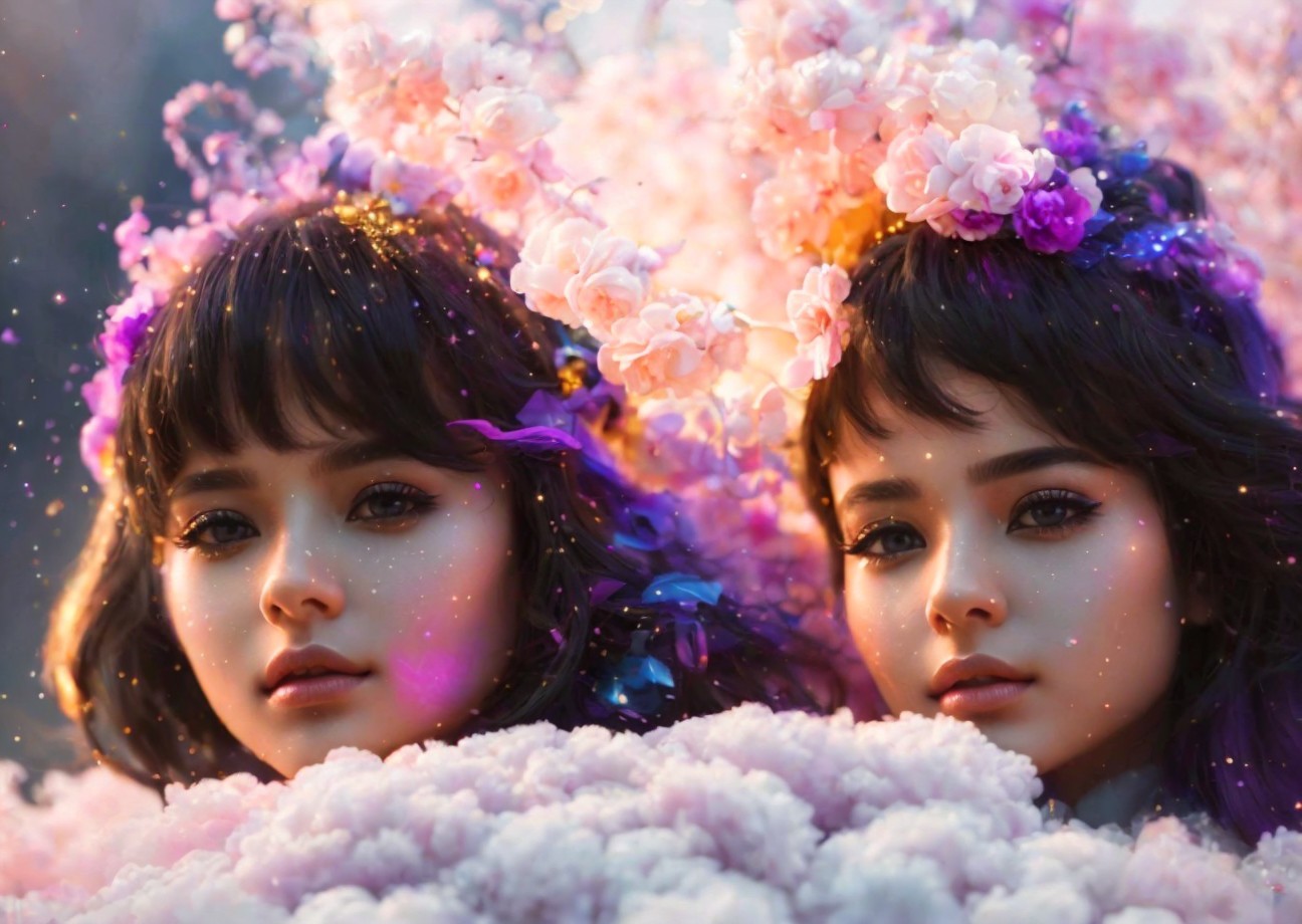 ("Try it" from a other user) - Twin girls surrounded by pink flowers, with purple petals in their hair, giving off a magical, fairy-tale atmosphere.