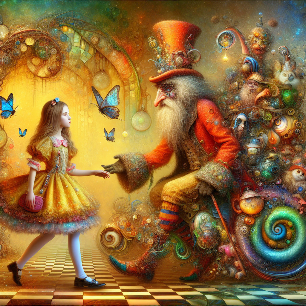 A whimsical scene featuring a cat in a top hat, sitting at a table with teacups, surrounded by curious cats and rabbits in a vibrant, enchanted garden. Magical atmosphere with bright colors.