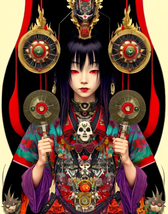 Traditional Attire with Floral Patterns and Ceremonial Weapons
