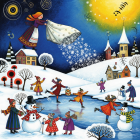 In a snowy landscape, children skate and build a snowman while a fairy floats above, scattering snowflakes and feathers. Colorful houses dot the background under a starry night sky.