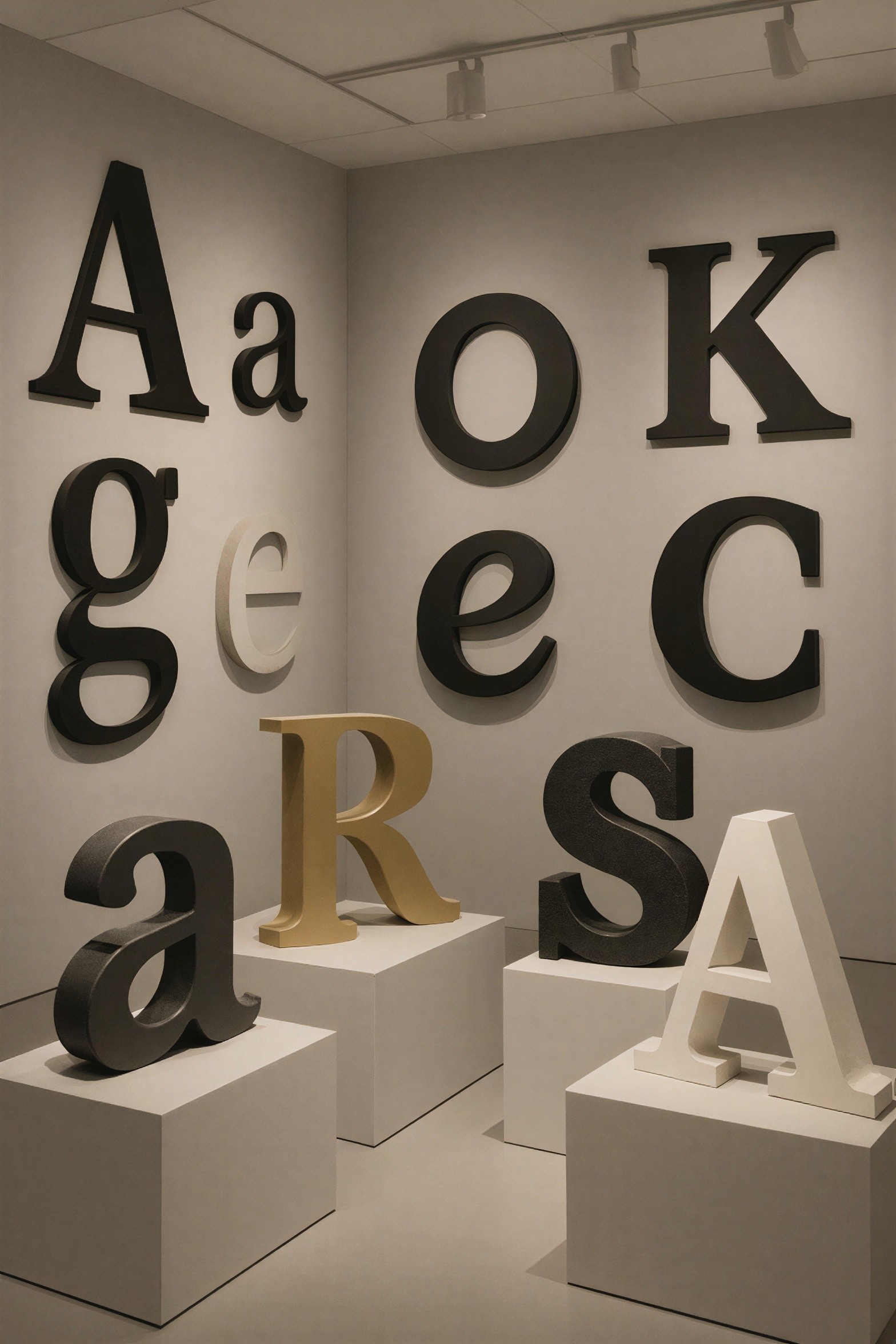 Large 3D letters of various fonts and finishes are displayed in a modern art exhibit. The letters are mounted on light gray walls and displayed on white pedestals across the room.