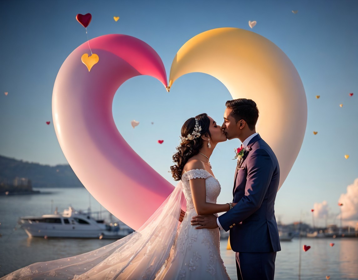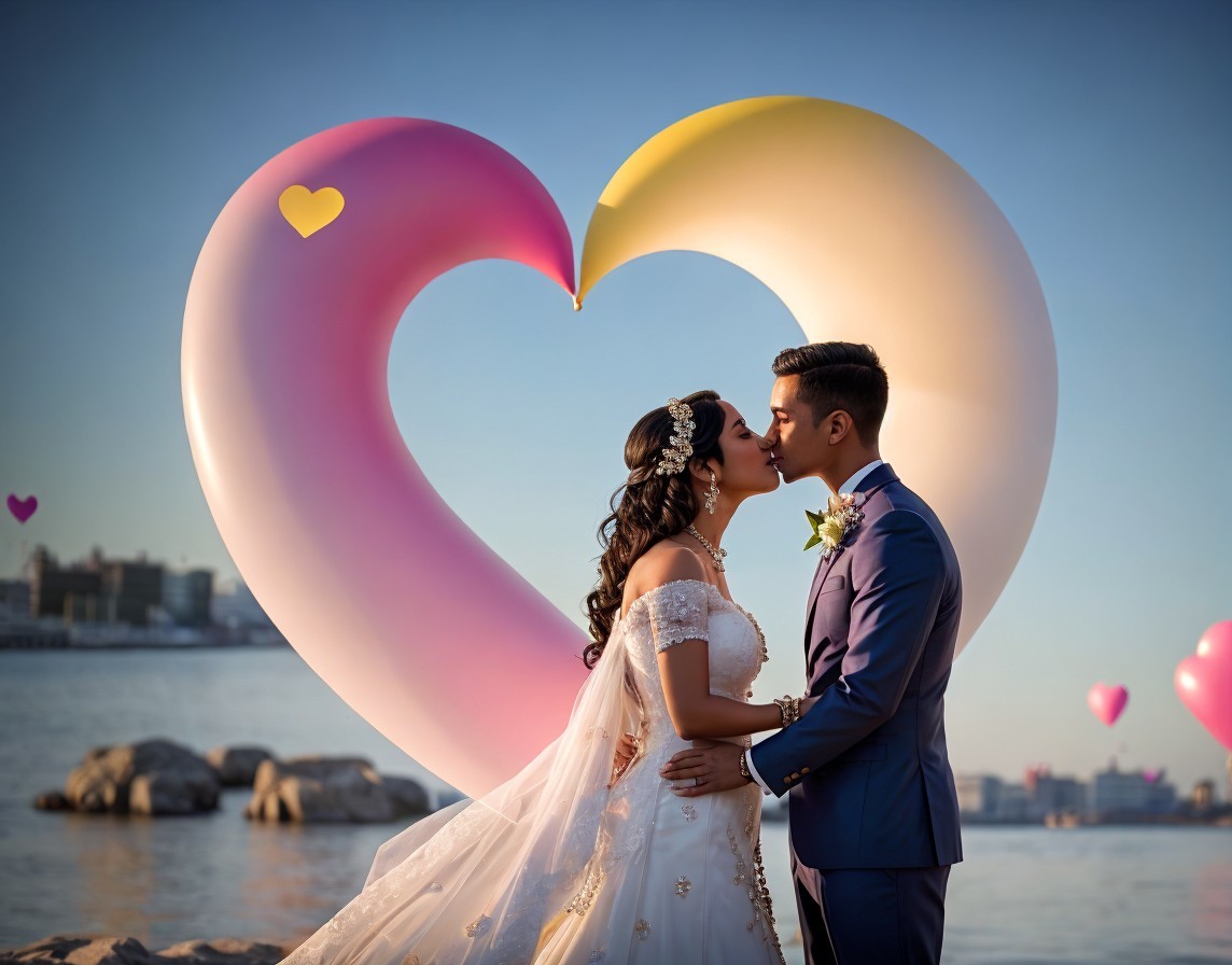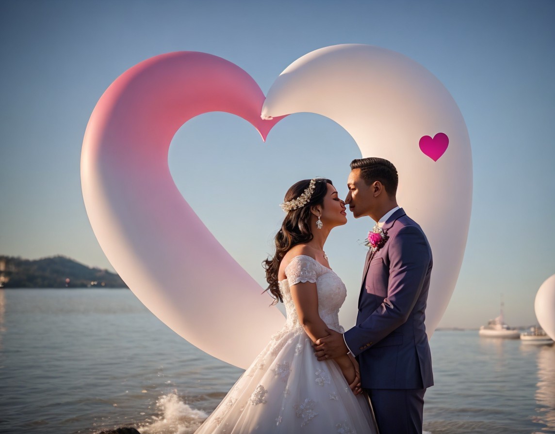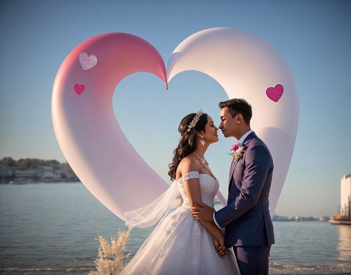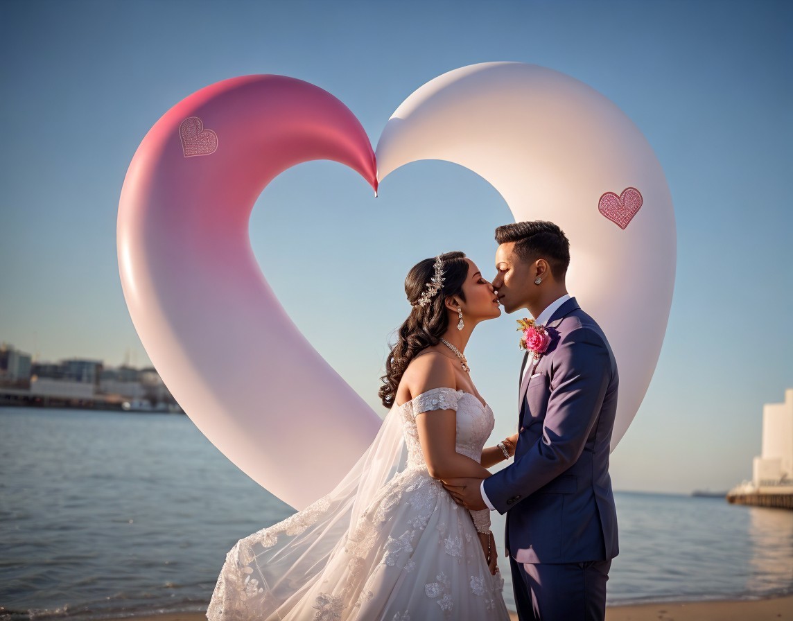 A couple in wedding attire lovingly gaze at each other, framed by a large heart sculpture, with the ocean and skyline in the background.