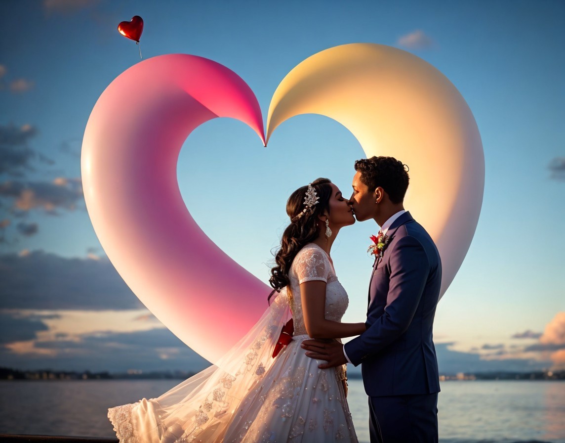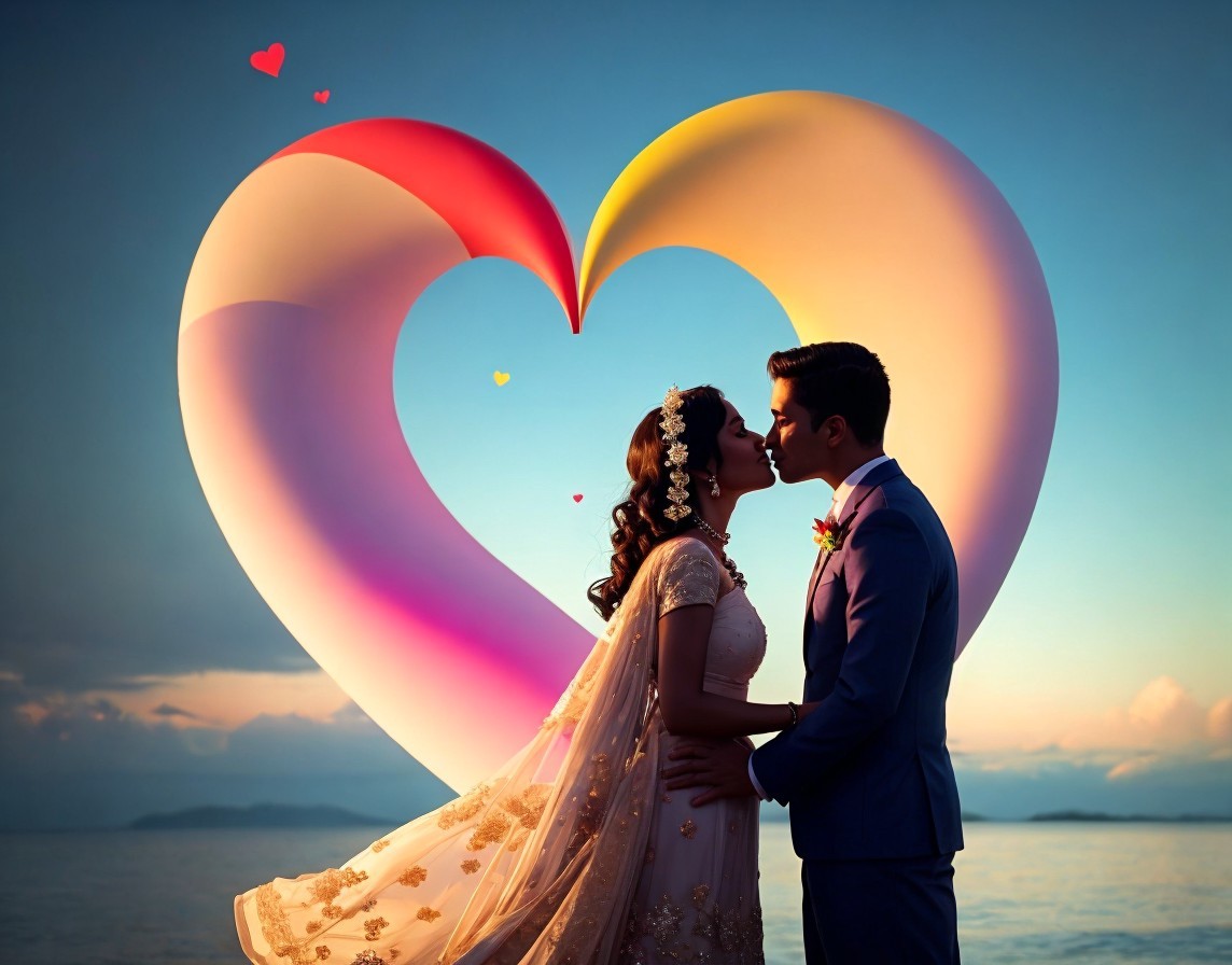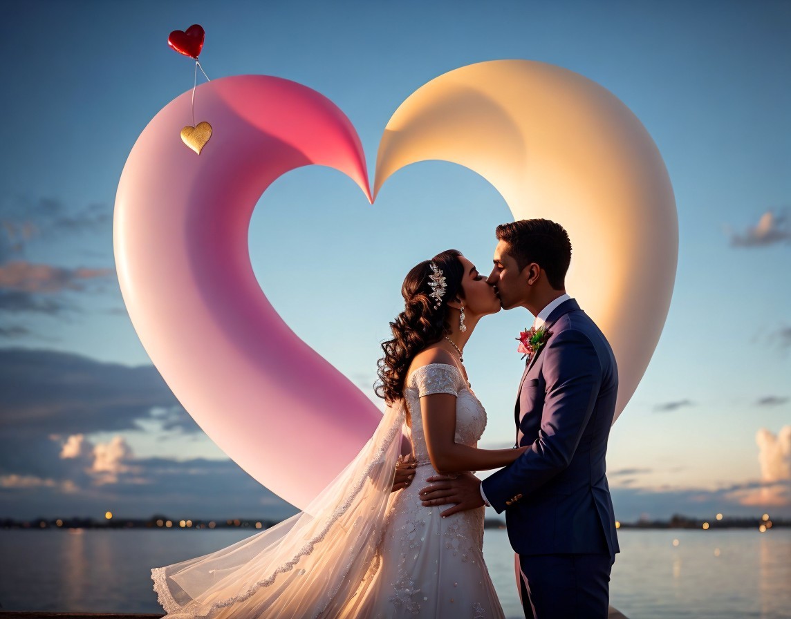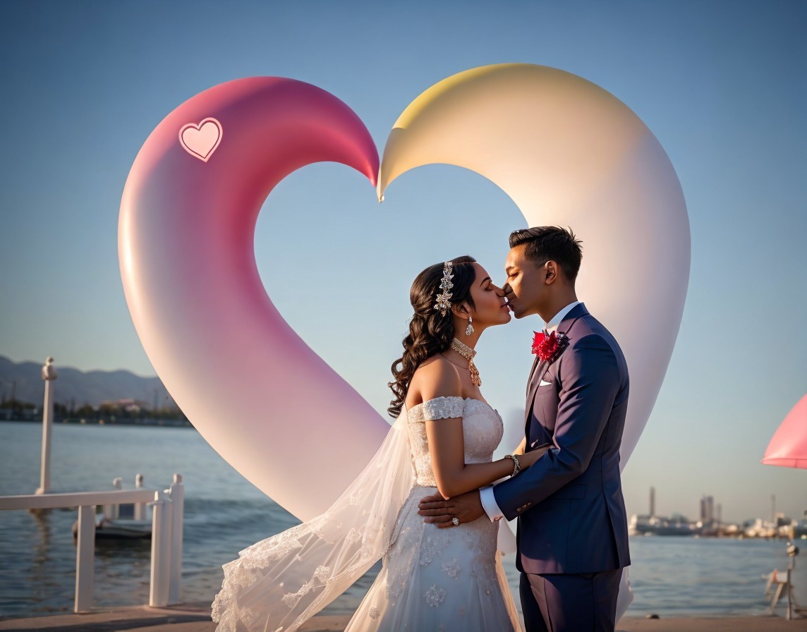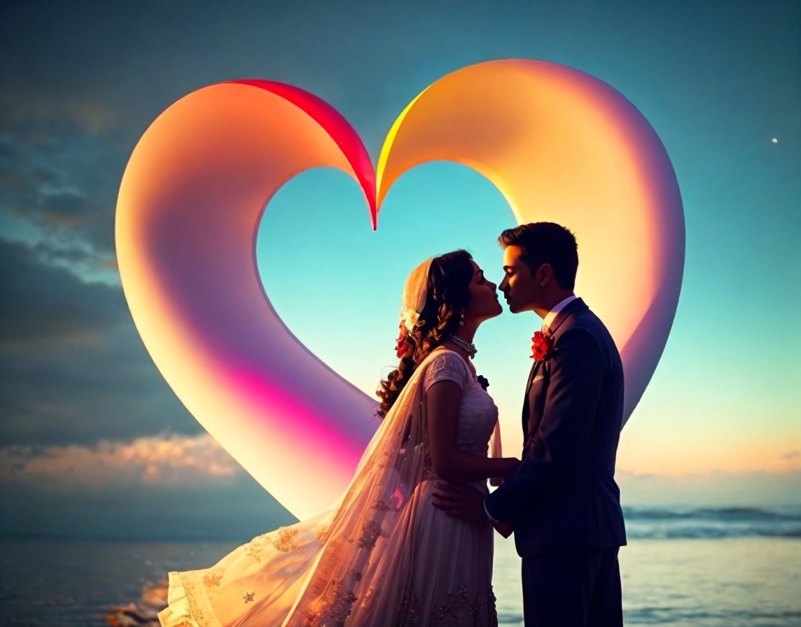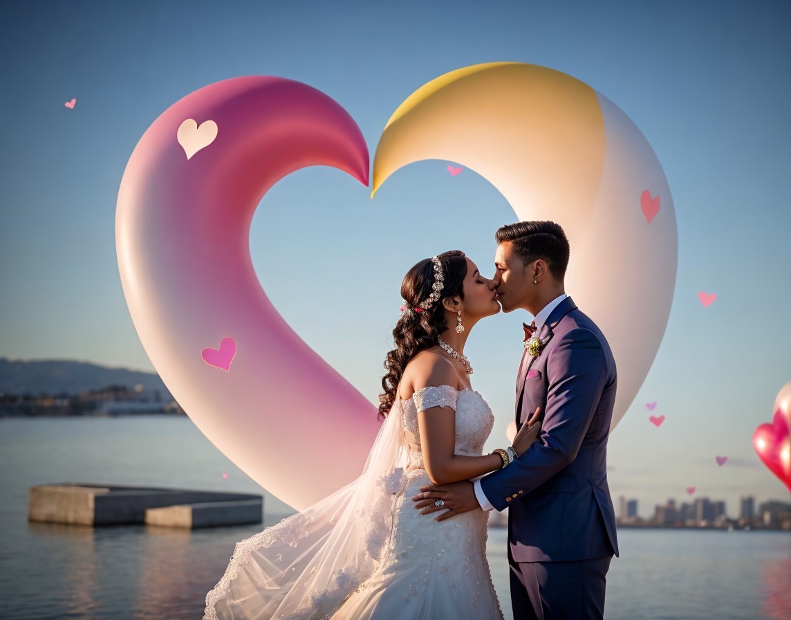 A couple in wedding attire lovingly gaze at each other, framed by a large heart sculpture, with the ocean and skyline in the background.
